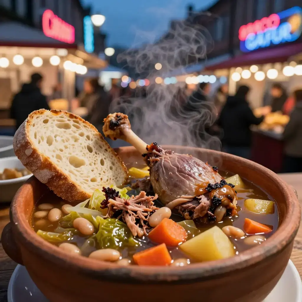 # Garbure Gasconne (Garbure) Garbure is the great peasant soup of Gascony in south-west France — a thick, smoky, deeply nourishing broth of cabbage, white beans, and preserved meats that is considered by many Gascons to be the region's soul food. Traditionally so thick a spoon should stand upright in it, the soup improves remarkably with reheating. Serves: 6 ## Ingredients - 300 g (1½ cups) dried haricot beans, soaked overnight and drained - 400 g (14 oz) smoked pork hock or smoked gammon - 200 g (7 oz) smoked pork belly or smoked lardons - 1 confit duck leg (or 200 g / 7 oz additional smoked pork) - 1 small Savoy or green cabbage (about 600 g / 1¼ lb), core removed and roughly chopped - 3 medium potatoes (500 g / 1 lb), peeled and diced - 2 large carrots, sliced into rounds - 2 turnips, peeled and diced - 1 large onion, roughly chopped - 4 cloves garlic, smashed - 2 bay leaves - 4 sprigs fresh thyme - 2 litres (8 cups) water or light chicken stock - Salt and black pepper - Crusty country bread, to serve ## Instructions 1. Place the drained beans in a large pot with the smoked pork hock. Cover with the water or stock and bring to a boil. Skim thoroughly. Add onion, garlic, bay leaves, and thyme, then simmer 45 minutes. 2. Add carrots, turnips, and smoked belly or lardons. Continue simmering 20 minutes. 3. Add potatoes and cook a further 15 minutes until beginning to soften. 4. Add the cabbage in batches, pressing it down into the liquid. Add the confit duck leg if using. Simmer 20–25 minutes more until the cabbage is tender and the soup is very thick. 5. Remove the pork hock and duck leg. Pull the meat off the bones, shred coarsely, and return to the pot. Discard bones and excess skin. 6. Taste and season generously with salt and black pepper. The soup should be very thick — add a splash of water if it is too dense. Ladle into deep bowls and serve with country bread. **Cook's Notes:** Garbure is better the next day. Gascons sometimes serve the broth first as a soup, then the meats and vegetables as a second course. A splash of Armagnac stirred in at the end is not traditional but is very Gascon in spirit.Images