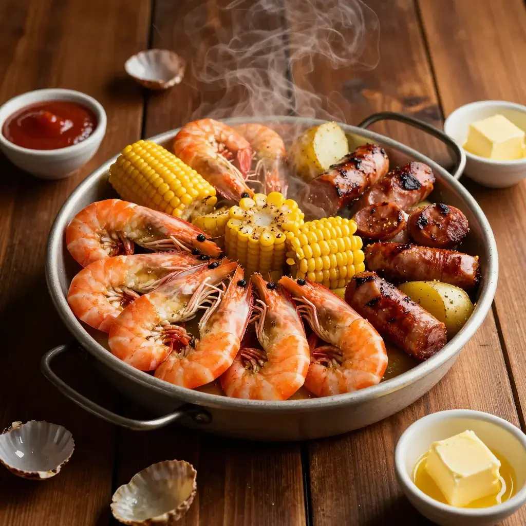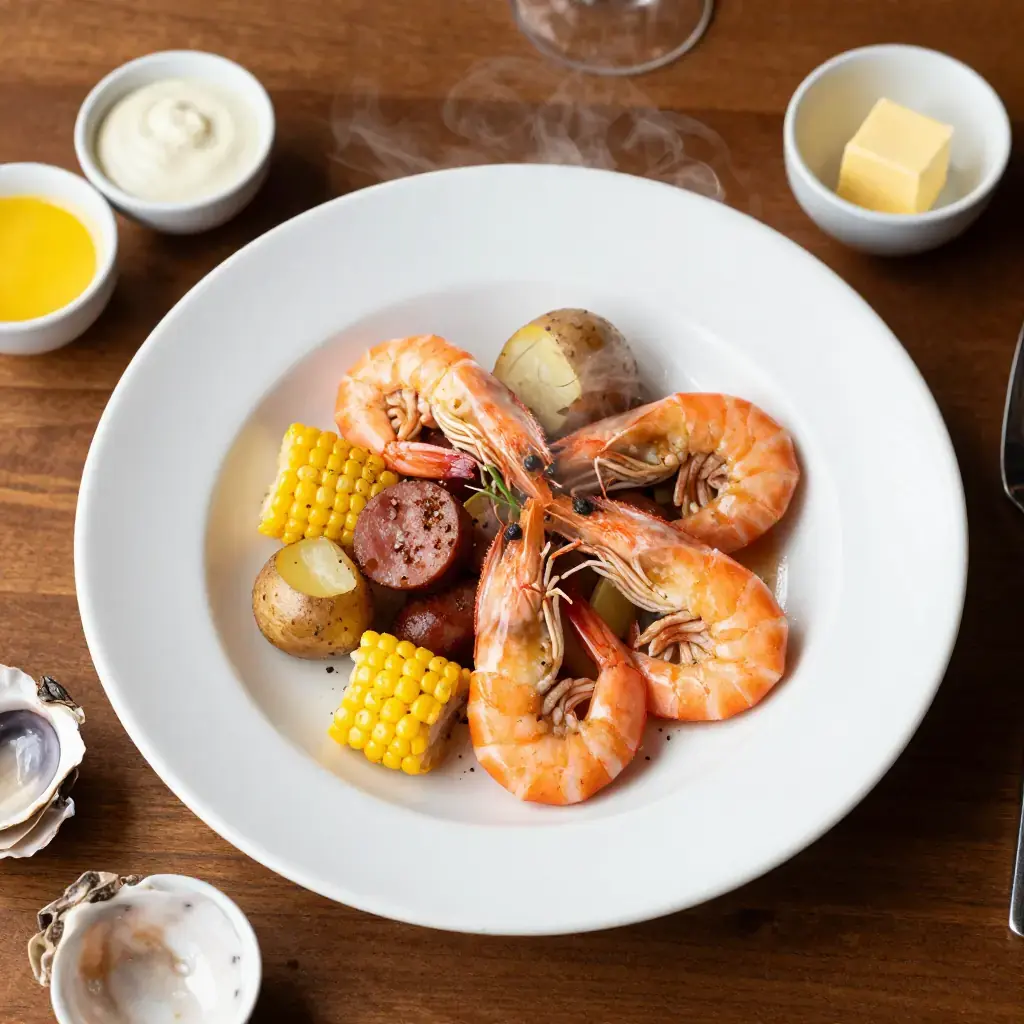 # Lowcountry Boil Frogmore Stew — named for a community on St. Helena Island, South Carolina — is the great communal feast of the American Lowcountry coast. Shrimp, smoked sausage, sweet corn and new potatoes are boiled together in a fiercely spiced crab-boil broth and then dumped in a glorious heap onto a newspaper-covered table. It is a celebration in a pot. Serves: 6 ## Ingredients - 1 kg (2.2 lb) large shell-on shrimp, heads on if possible - 450g (1 lb) smoked andouille or kielbasa sausage, sliced into 5cm (2-inch) rounds - 4 ears sweet corn, each cut into thirds - 700g (1.5 lb) small new potatoes, halved if large - 3 tbsp (45g) Old Bay seasoning - 1 tbsp (15g) fine salt - 1 tsp (5g) black pepper, cracked - 4 garlic cloves, smashed - 2 lemons, halved - 1 bay leaf - 4 litres (4 quarts) water - Cocktail sauce, melted butter and hot sauce, to serve ## Instructions 1. Bring water to a rolling boil in your largest pot. Add Old Bay, salt, pepper, garlic, bay leaf and the juice of 1 lemon. Squeeze lemon halves into the pot and drop them in. 2. Add potatoes. Cook 10 minutes at a steady boil. 3. Add sausage. Cook 5 minutes. 4. Add corn. Cook 4 minutes. 5. Add shrimp. Cook 2–3 minutes only, until just pink and curled. Do not overcook. 6. Drain immediately through a colander. Spread onto a newspaper-lined table or a large platter. 7. Serve with cocktail sauce, melted butter, hot sauce and remaining lemon halves. **Cook's Notes:** The timing is everything — add ingredients in reverse order of cooking time so everything finishes together. Use the biggest pot you own. Shell-on shrimp stay juicier and are part of the messy, hands-on fun of a proper Frogmore Stew.Images
