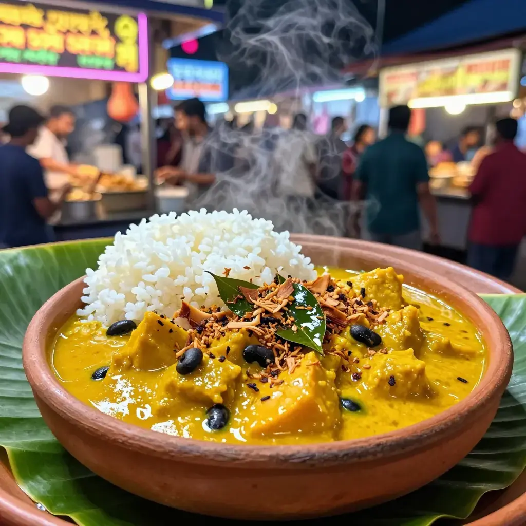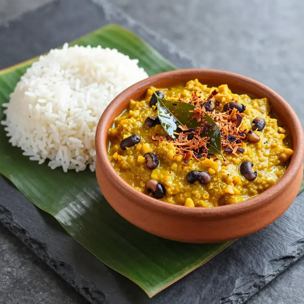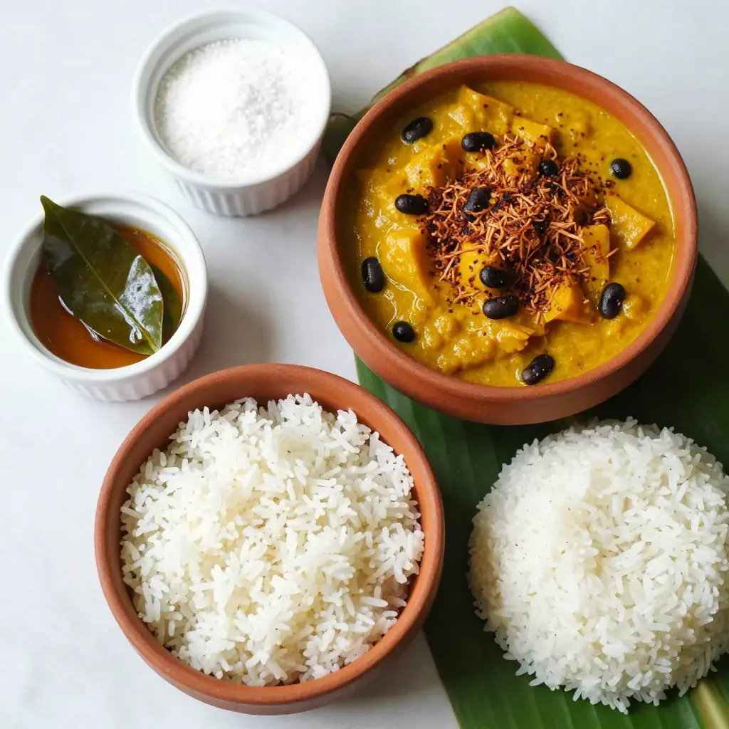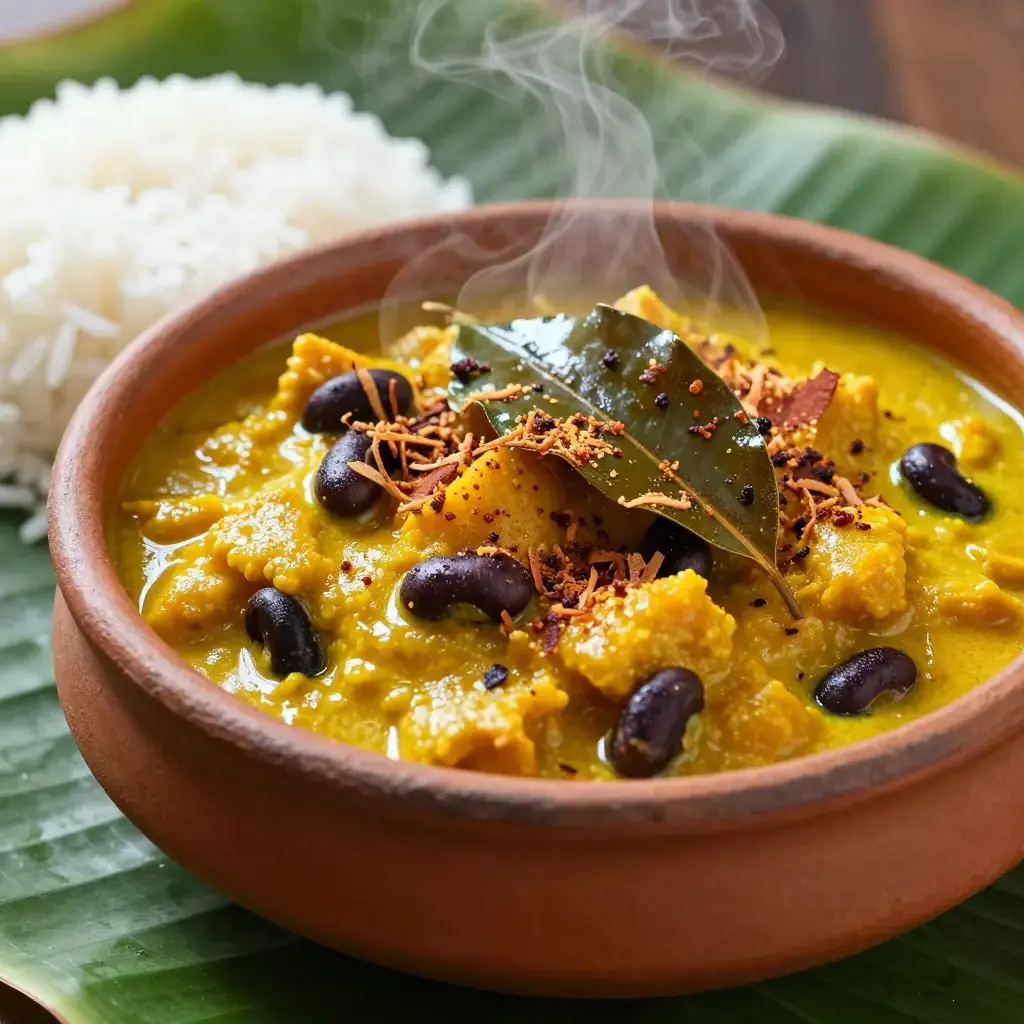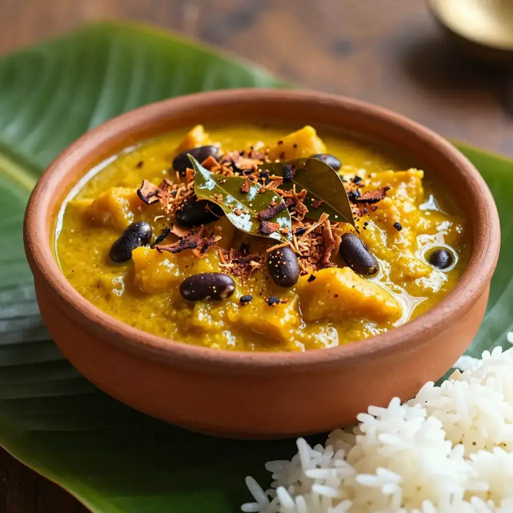 Erissery is an essential component of the Kerala Onam Sadhya — the grand vegetarian feast served on banana leaves during the harvest festival. This thick, lightly spiced curry combines pumpkin or raw banana with black-eyed peas in a turmeric-coconut gravy, finished with a fragrant tempering of coconut oil, mustard seeds and dried red chilli. It is the definition of Kerala vegetarian comfort food.