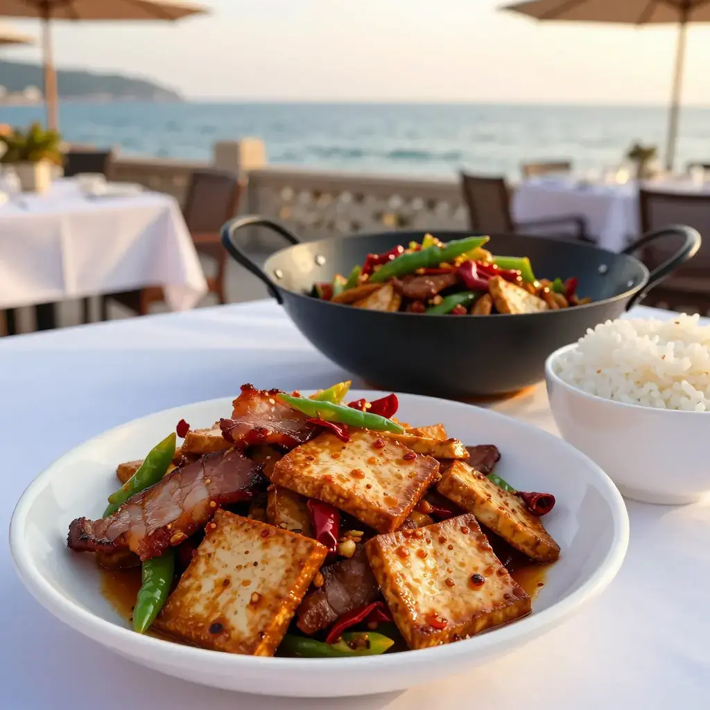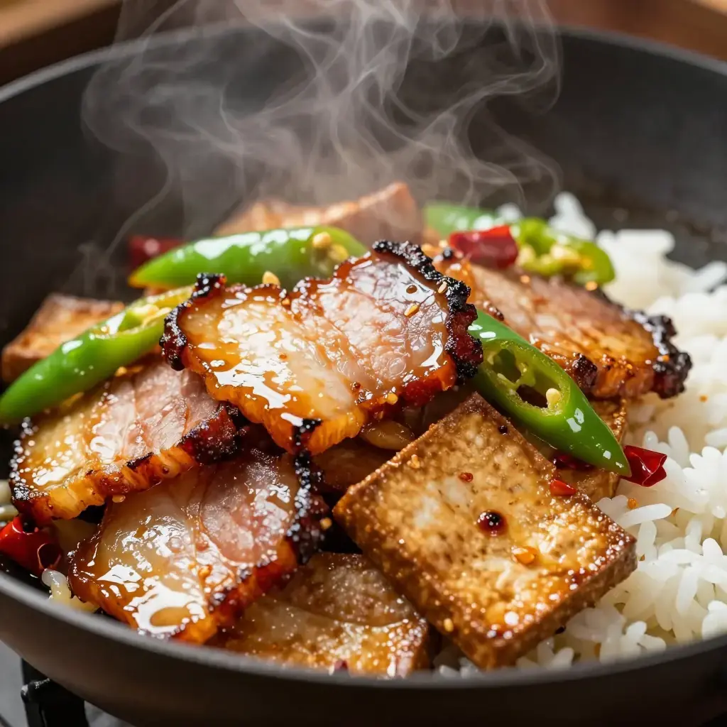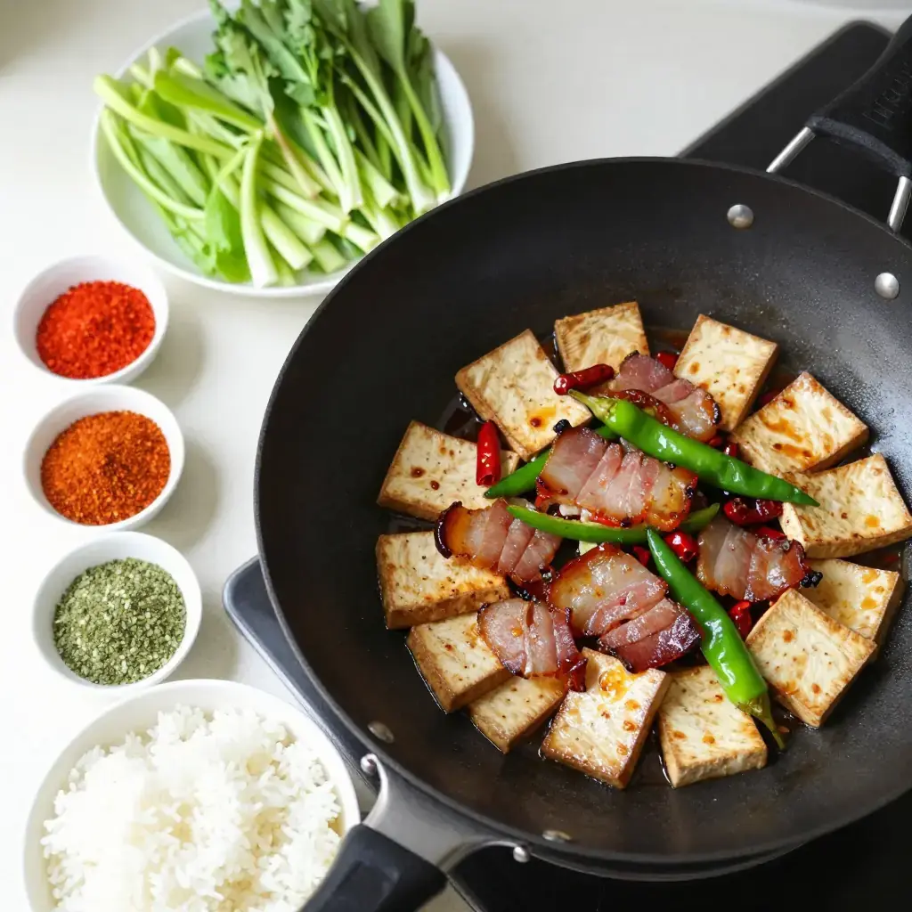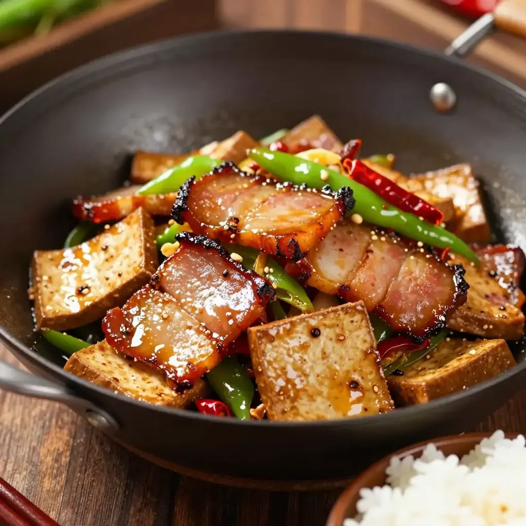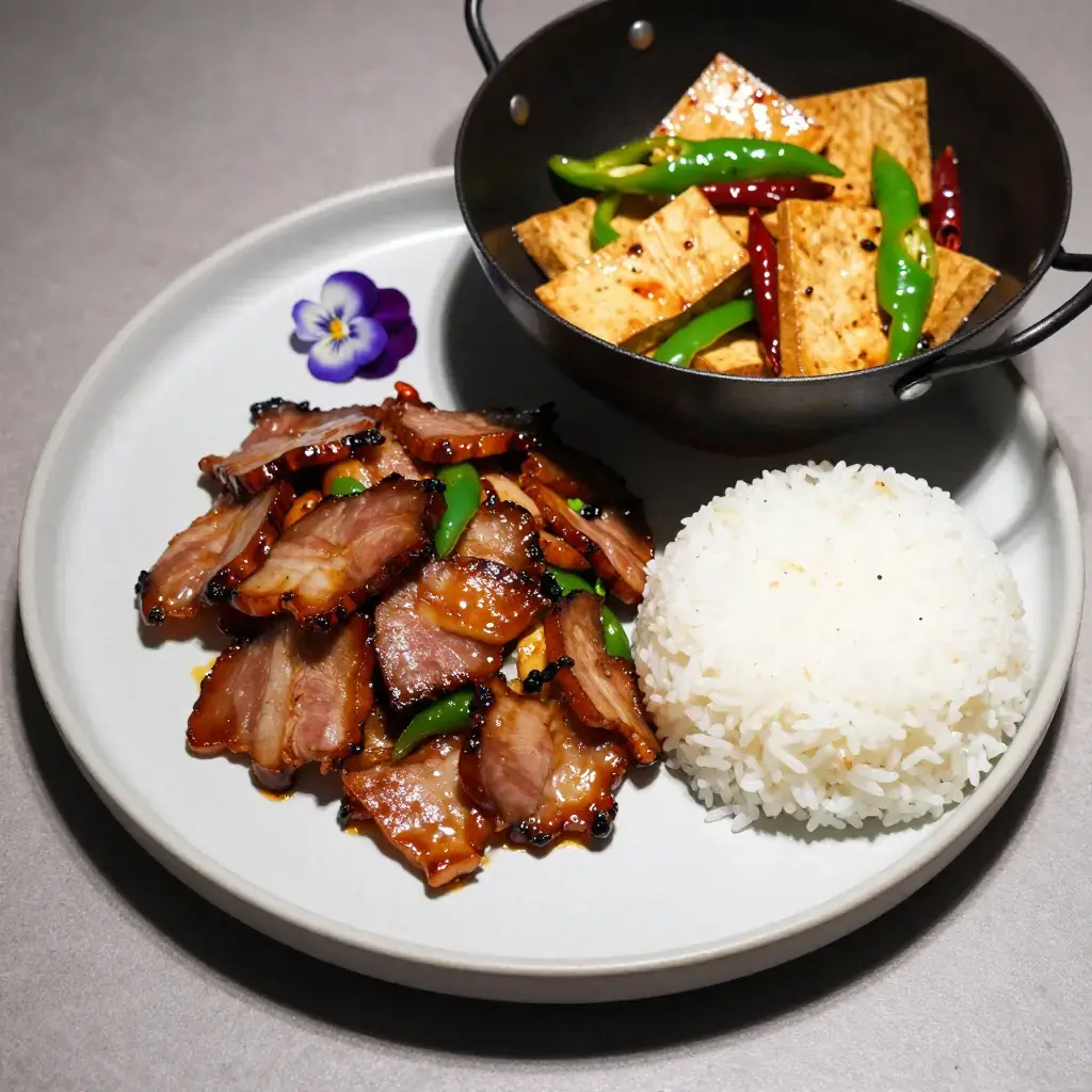 # Dou Gan Chao La Rou Dou Gan Chao La Rou is a quintessential Hunan household dish — chewy dry-pressed tofu (dou gan) stir-fried with la rou, the wind-dried, smoke-cured pork that defines the Hunanese winter pantry. La rou is made each winter by hanging salted pork over smoldering cypress and rice husks, and its smoky richness transforms even the simplest stir-fry into something memorable. Serves: 4 ## Ingredients - 300g (10 oz) Hunan smoked pork belly (la rou) or regular smoked bacon - 400g (14 oz) firm dry-pressed tofu (dou gan), sliced into thin rectangles - 3-4 dried red chillies, torn in half - 1 green bell pepper or 2 long green chillies, sliced - 3 garlic cloves, thinly sliced - 2 tbsp (30ml) light soy sauce - 1 tbsp (15ml) Shaoxing rice wine - 1 tsp (5g) sugar - 2 spring onions, sliced - 1 tbsp (15ml) vegetable oil (only if pork is lean) - Salt to taste ## Instructions 1. If using whole smoked pork belly, bring a pot of water to a boil and simmer the pork for 15 minutes to remove excess saltiness and soften slightly. Drain and slice thinly. 2. Heat a wok over high heat until smoking. Add the smoked pork slices — they will quickly render their own fat. Stir-fry for 3-4 minutes until lightly crisped and fragrant. 3. Add the dried chillies and garlic; stir-fry 30 seconds. 4. Add the dry tofu slices and green pepper. Toss and stir-fry for 3-4 minutes until the tofu is heated through and beginning to take on colour from the pork fat. 5. Add the Shaoxing wine, soy sauce, and sugar. Toss everything together for 1-2 minutes over high heat. 6. Taste and adjust salt carefully — the smoked pork is already salty. Stir in the spring onions. 7. Serve immediately over steamed white rice. **Cook's Notes:** Dou gan (dry tofu) has a chewy, dense texture quite different from silken or regular firm tofu — do not substitute. It absorbs the smoky pork fat beautifully. If authentic Hunanese la rou is unavailable, German Schwarzwälder Speck or thick smoked bacon makes a reasonable substitute.Images