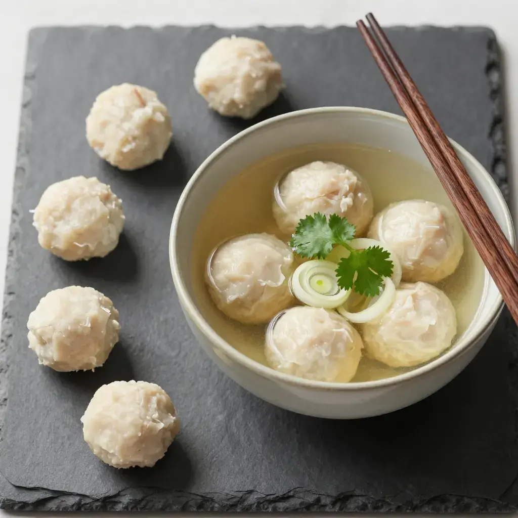 # Fujian Qing Tang Yu Wan (清汤鱼丸) Fujian fish balls are a point of regional pride — springy, bouncy spheres of pure fish paste that are so prized that local restaurants display their elasticity like a sport. Unlike starchy imitation fish balls, authentic yu wan are hand-beaten from fresh Spanish mackerel or grass carp until the protein bonds form a supple, meat-free emulsion. They are served in a delicate clear broth seasoned with white pepper and sesame oil, a bowl of quiet perfection. Serves: 4 ## Ingredients **Fish balls:** - 500g (1 lb 2 oz) very fresh mackerel or grass carp fillets, skin and pin bones removed, chilled - 1 tsp (5g) salt - ½ tsp (2g) sugar - 1 tsp (5ml) light soy sauce - 2 tsp (10ml) Shaoxing rice wine - 1 egg white - 2 tbsp (30ml) ice-cold water **Broth:** - 1.2 litres (5 cups) clear chicken or fish stock - 1 tsp (5ml) light soy sauce - ½ tsp (2g) white pepper - 1 tsp (5ml) sesame oil - 2 spring onions, sliced - Fresh coriander to garnish ## Instructions 1. Chill fish thoroughly. Dice roughly and process in a food processor to a rough paste. Transfer to a bowl. 2. Add salt, sugar, soy sauce, rice wine, and egg white. Beat vigorously with a wooden spoon — or use a stand mixer with the paddle attachment — for 8–10 minutes until the paste becomes smooth, sticky, and pulls away from the bowl in a single mass. 3. Add ice-cold water, 1 tbsp at a time, beating between additions. The finished paste should be glossy and springy. 4. Test: drop a small ball into hot water. It should float after 2 minutes and bounce when pressed. Adjust seasoning if needed. 5. Bring a large pot of water to a gentle simmer (not boiling — vigorous boiling toughens the balls). Using wet hands or two wet spoons, shape the paste into 3cm (1-inch) balls and lower gently into the water. 6. Poach 6–8 minutes until the balls float and are cooked through. Remove with a slotted spoon. 7. Heat stock, season with soy sauce, white pepper, and sesame oil. Add fish balls and warm through for 2 minutes. 8. Ladle into bowls and garnish with spring onion and coriander. **Cook's Notes:** The vigorous beating is non-negotiable — it develops the myosin proteins responsible for the characteristic bounce. Chilling the fish and using ice water prevents the paste from warming and breaking during mixing.Images