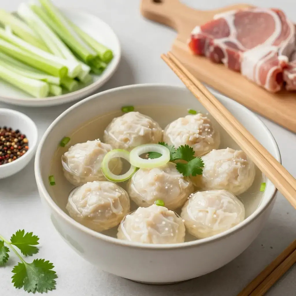 - Heat stock, season with soy sauce, white pepper, and sesame oil. Add fish balls and warm through for 2 minutes.