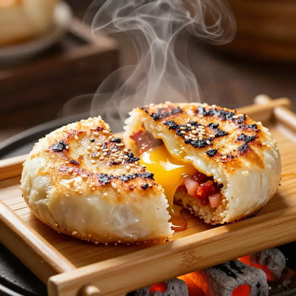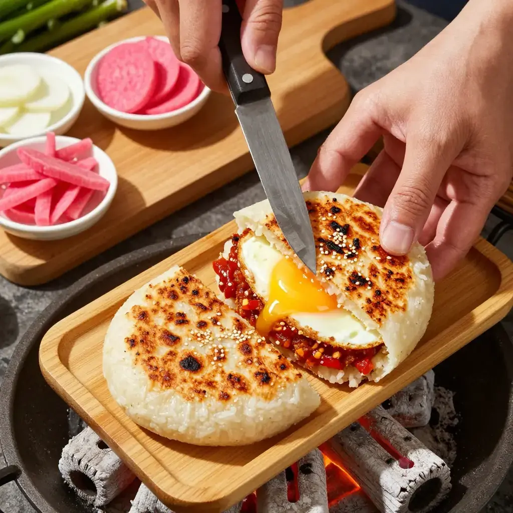 # Yunnan Er Kuai (饵块) Er Kuai is Yunnan's answer to the question of what to do with glutinous rice when you pound it into submission. These dense, chewy pressed cakes have been made in the province for over a thousand years, eaten for breakfast grilled over charcoal or sliced and stir-fried. Modern street vendors split them open, slather them with bean paste, pickled vegetables, and fried egg, and serve them like a filled flatbread — a contemporary fusion of ancient grain culture and evolving tastes. Serves: 4 ## Ingredients - 4 pieces er kuai rice cake (or 600g/1 lb 5 oz short-grain glutinous rice, pre-cooked and pounded) - 2 tbsp (30g) sesame seeds, toasted - 2 tbsp (30ml) sesame oil - 3 tbsp (45g) Yunnan spiced chilli paste (xiang la jiang) or Korean gochujang - 2 tbsp (30g) sweet fermented bean paste (tian mian jiang) - 4 eggs - 60g (2 oz) Yunnan pickled radish (yan cai), drained - 2 spring onions, finely sliced - Cooking oil as needed ## Instructions 1. If making er kuai from scratch: soak glutinous rice overnight. Steam 35 minutes until fully cooked. While hot, pound in a large mortar or with a wet rolling pin until a cohesive, slightly sticky mass forms. Shape into flat oval cakes about 1.5cm (⅝ inch) thick. Refrigerate until firm, at least 1 hour. 2. Preheat a charcoal grill, griddle, or heavy cast-iron pan over medium-high heat. Brush er kuai cakes with sesame oil. 3. Grill cakes for 3–4 minutes each side until a golden-brown crust with charred patches forms and the interior softens. 4. Fry eggs sunny-side up in a separate pan in a little oil, 2–3 minutes. 5. Mix chilli paste and bean paste together into a spreadable sauce. Stir in toasted sesame seeds. 6. Slit each grilled cake horizontally through the middle (like a pita pocket). Spread the chilli-bean paste generously on the inside surfaces. 7. Stuff with a fried egg, a spoonful of pickled radish, and spring onions. Press together gently and serve. **Cook's Notes:** Pre-made er kuai can be found in Chinese supermarkets, often labelled Yunnan rice cake. The combination of charcoal char and sweet-spicy filling is the essence of Yunnan morning markets. Leftover er kuai can be sliced and stir-fried with vegetables for a satisfying lunch.Images