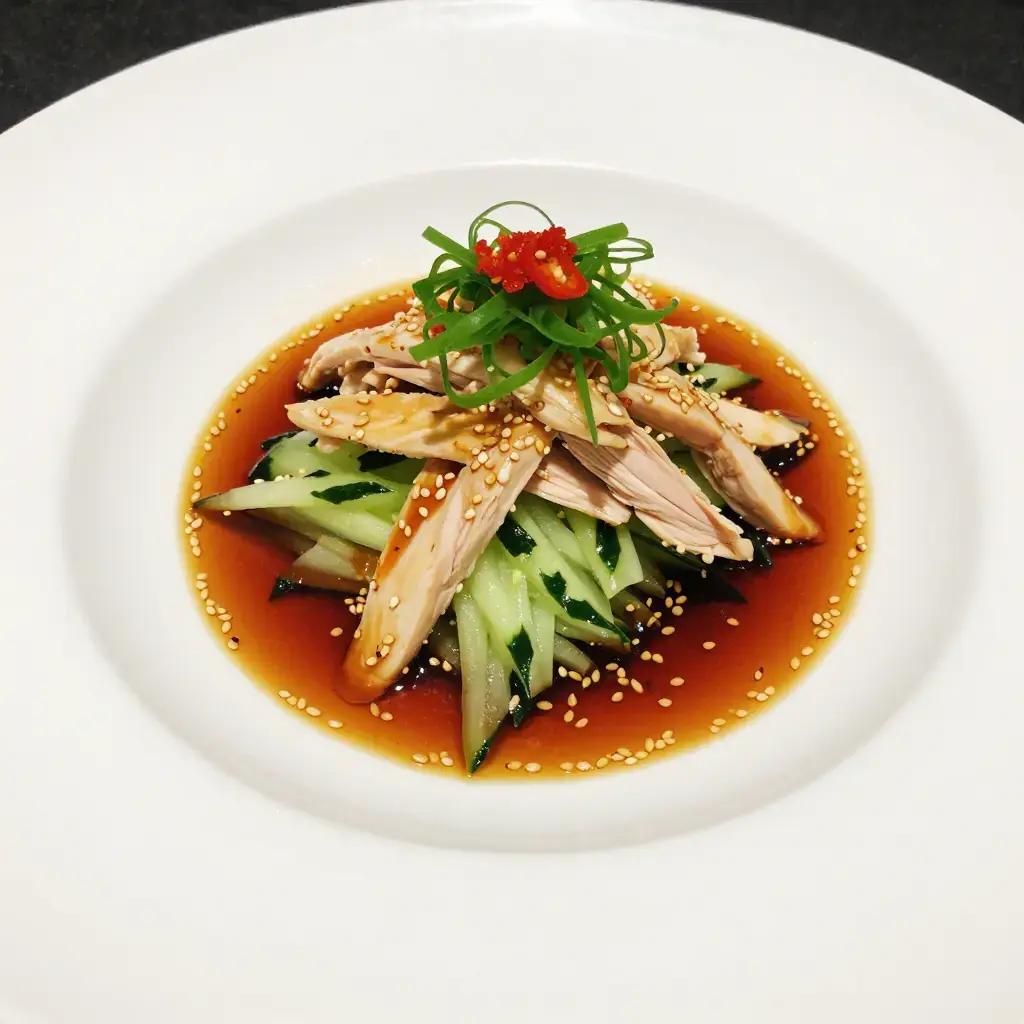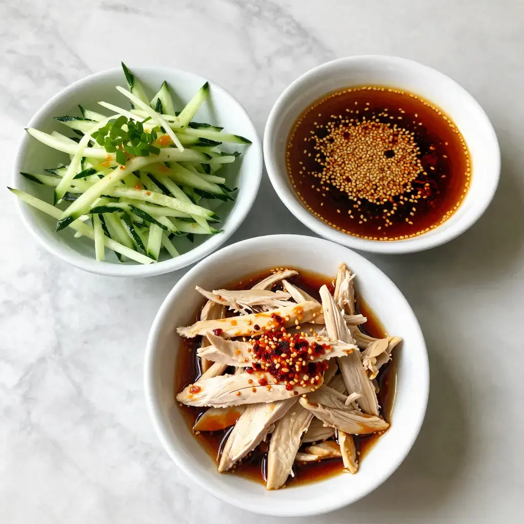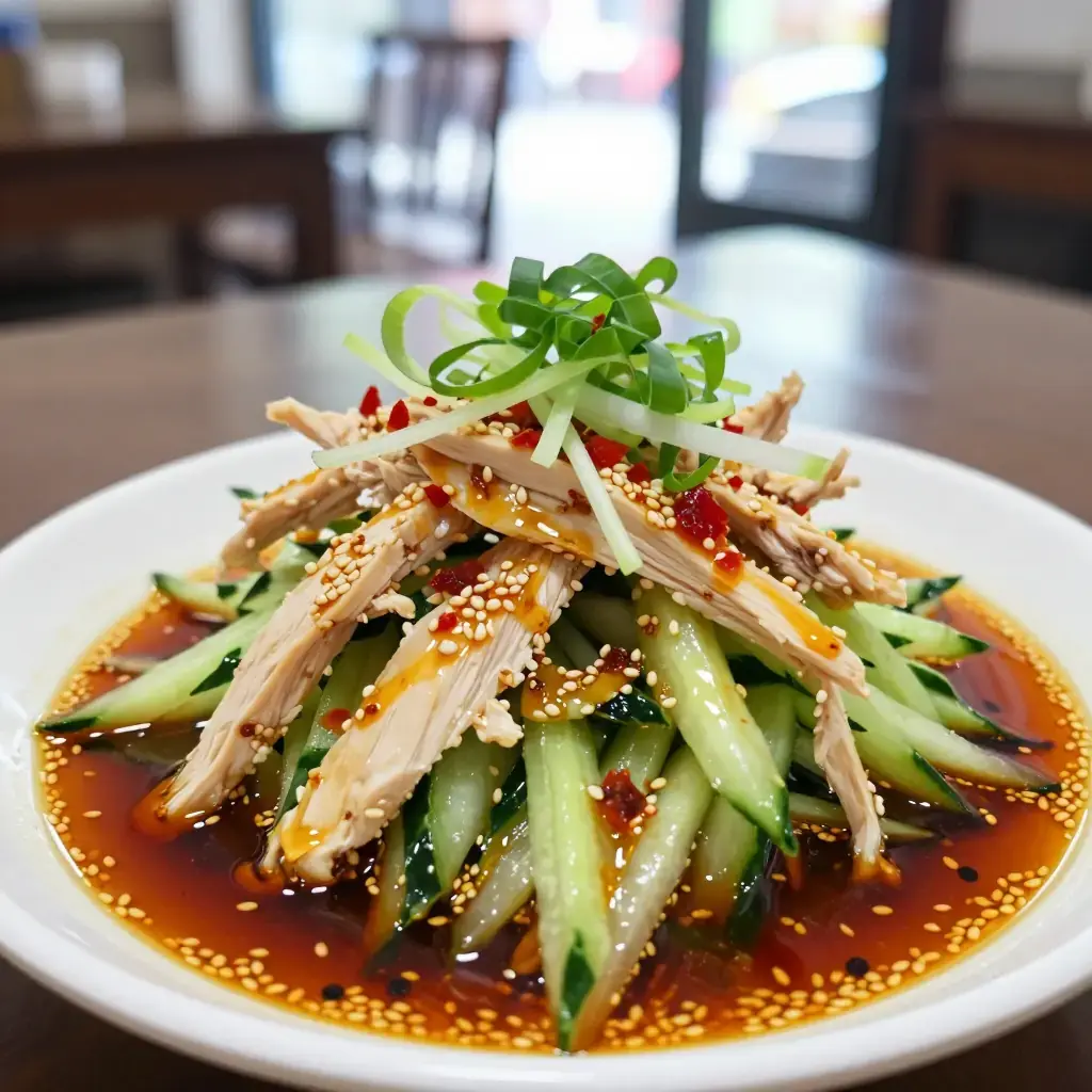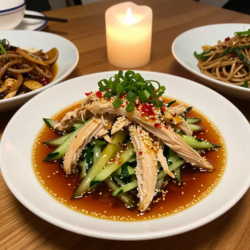 - Arrange cucumber julienne on a serving plate. Pile shredded chicken on top. Pour sauce evenly over the chicken.
