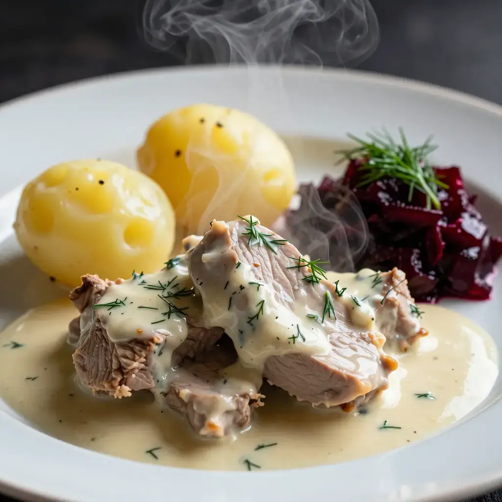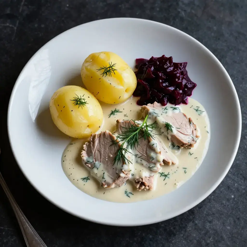 # Dillkött Dillkött — literally "dill meat" — is a cornerstone of Swedish husmanskost, the honest home cooking that Swedes regard with the same reverence the French apply to cuisine bourgeoise. Tender veal simmered in broth until it is yielding and pale, then napped in a bright, fresh dill velouté, it is restorative and deeply comforting. Traditionally served on a Thursday alongside boiled potatoes and pickled beetroot. Serves: 4 ## Ingredients ### Braised Veal - 1kg (2¼ lb) bone-in veal shoulder or breast, cut into 5cm (2 in) chunks - 1 yellow onion, halved - 2 carrots, roughly chopped - 2 celery stalks, roughly chopped - 1 bay leaf - 8 black peppercorns - 1 tsp salt - 1.5 litres (6 cups) cold water ### Dill Sauce - 40g (3 tbsp) unsalted butter - 40g (5 tbsp) plain flour - 600ml (2½ cups) strained veal cooking broth - 120ml (½ cup) single cream - 1 tbsp (15ml) white wine vinegar or lemon juice - 1 tsp caster sugar - Large bunch of fresh dill, fronds only, roughly chopped (about 30g / 1 oz) - Salt and white pepper to taste ### To Serve - 600g (1¼ lb) small waxy potatoes, boiled - Pickled beetroot ## Instructions 1. Place the veal in a large pot with the onion, carrots, celery, bay leaf, peppercorns, and salt. Cover with cold water. Bring slowly to a boil, skimming any grey foam from the surface over the first 10 minutes. 2. Reduce heat to a gentle simmer. Cook, partially covered, for 1 hour 30 minutes to 2 hours until the veal is completely tender when pierced with a fork. Strain and reserve 600ml (2½ cups) of the broth. Discard the vegetables. 3. Make the dill sauce: melt butter in a saucepan over medium heat. Whisk in the flour and cook, stirring, for 2 minutes — do not let it colour. Gradually whisk in the warm broth, a ladleful at a time, until smooth and thickened. Simmer 5 minutes. 4. Stir in the cream, vinegar, and sugar. Season with salt and white pepper. The sauce should be velvety and slightly tangy. Add the chopped dill and stir through. 5. Return the cooked veal to the pan and fold gently to coat in the sauce. Warm through on low heat for 5 minutes. 6. Serve with boiled potatoes and pickled beetroot. **Cook's Notes:** Do not add the dill until just before serving — prolonged heat turns it khaki and bitter. The broth from cooking the veal is excellent strained and refrigerated for later use as the base for other Swedish soups.Images