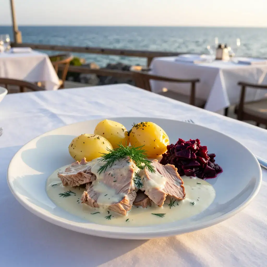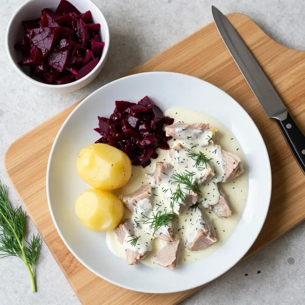 Dillkött — literally "dill meat" — is a cornerstone of Swedish husmanskost, the honest home cooking that Swedes regard with the same reverence the French apply to cuisine bourgeoise. Tender veal simmered in broth until it is yielding and pale, then napped in a bright, fresh dill velouté, it is restorative and deeply comforting. Traditionally served on a Thursday alongside boiled potatoes and pickled beetroot.