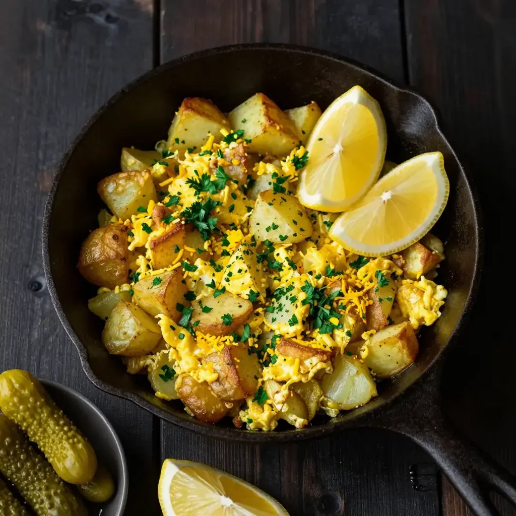 # Mfaraket Batata (مفركة البطاطا — Lebanese Potato and Egg Scramble with Herbs) Mfaraket Batata is a classic Lebanese home cook's lunch — diced potatoes pan-fried until crisp, then scrambled with eggs, fresh parsley, and warm spices. Quick, filling, and deeply satisfying, it is the kind of dish that appears on weekday lunch tables across Lebanon, served with pickles and flatbread. Serves: 4 ## Ingredients - 600g (1.3 lb) waxy potatoes, peeled and cut into 1.5cm (½ in) cubes - 4 large eggs - 3 tbsp (45ml) olive oil - 1 medium onion, diced - 2 cloves garlic, minced - 1 tsp (3g) ground cumin - ½ tsp (1.5g) ground turmeric - ½ tsp (2g) salt - ¼ tsp (1g) black pepper - Large handful fresh parsley, chopped - 1 lemon, cut into wedges for serving - Lebanese pickles, to serve ## Instructions 1. Parboil potato cubes in salted water for 5 minutes. Drain well and pat dry. 2. Heat olive oil in a large non-stick skillet over medium-high heat. Add potatoes in a single layer and cook without stirring for 5–6 minutes until golden on one side, then toss and cook a further 4–5 minutes until crisp all over. 3. Add onion and garlic, reduce heat to medium, and cook 4–5 minutes until softened. 4. Stir in cumin, turmeric, salt, and pepper and cook 1 minute. 5. Beat the eggs lightly and pour over the potato mixture. Let the eggs begin to set at the base, then gently fold and scramble until just cooked through — about 2–3 minutes. 6. Remove from heat, fold in most of the parsley, and garnish with the remainder. 7. Serve with lemon wedges and Lebanese pickles alongside warm flatbread. **Cook's Notes:** The key is getting the potatoes properly crisp before adding the eggs — soft potatoes make for a soggy scramble. A splash of pomegranate molasses on the side adds a lovely contrast.Images