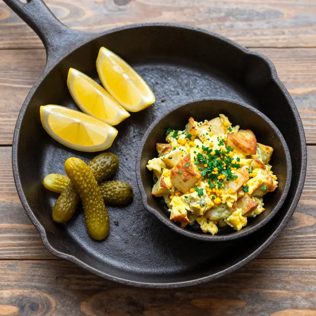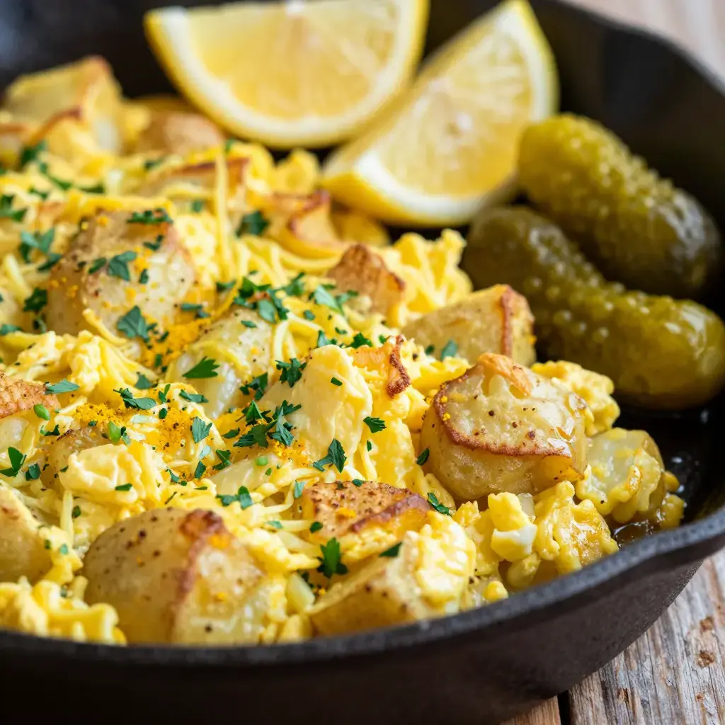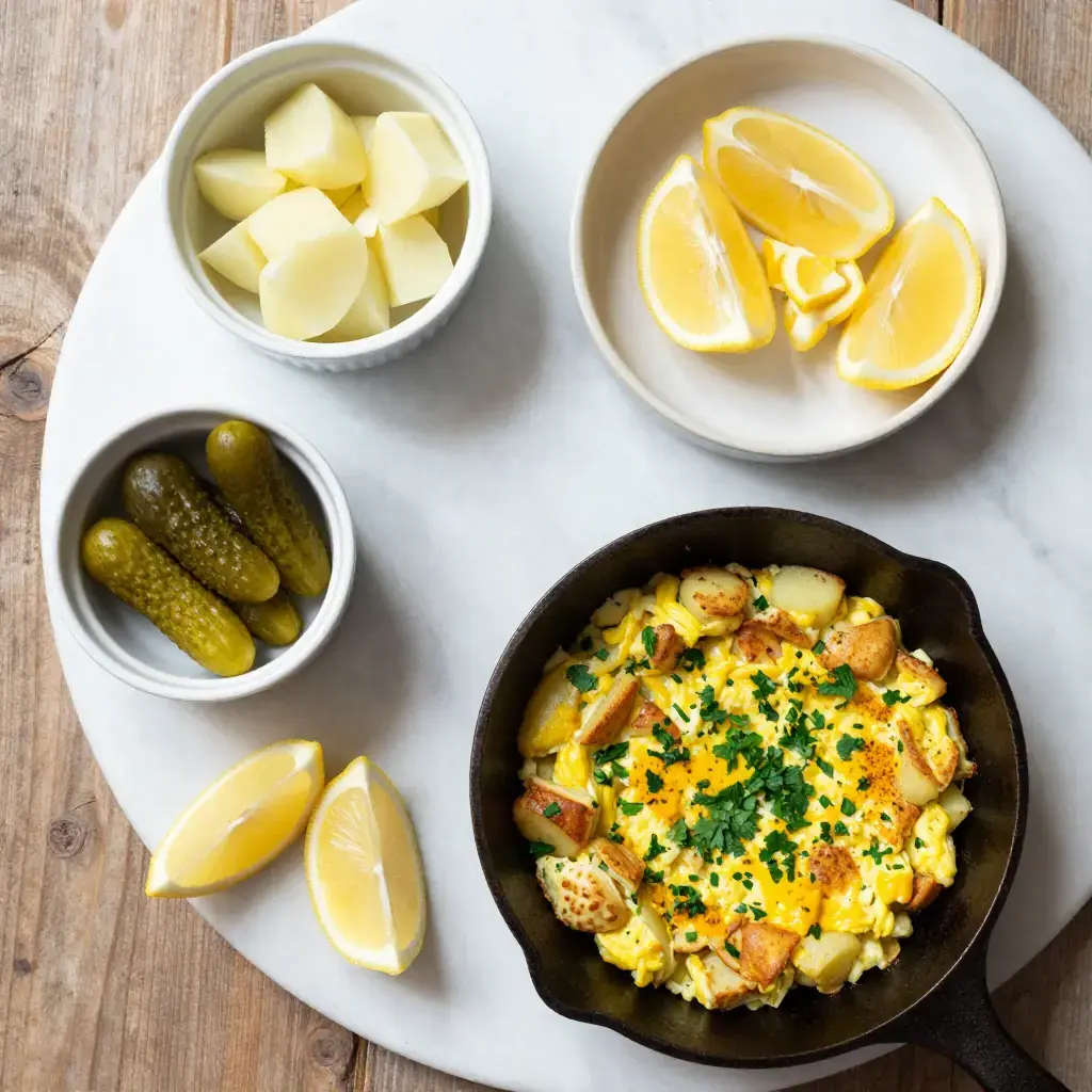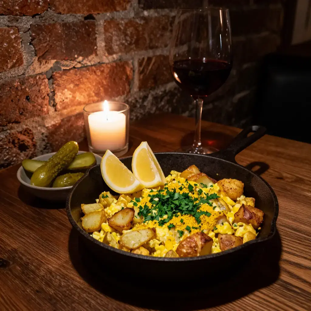 Mfaraket Batata is a classic Lebanese home cook's lunch — diced potatoes pan-fried until crisp, then scrambled with eggs, fresh parsley, and warm spices. Quick, filling, and deeply satisfying, it is the kind of dish that appears on weekday lunch tables across Lebanon, served with pickles and flatbread.