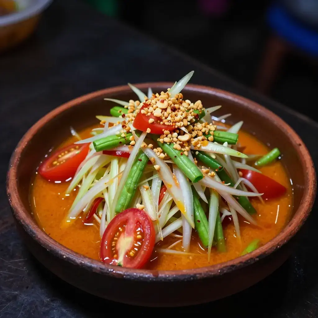 Som Tam Thai is Thailand's most iconic street salad — shredded green papaya pounded in a clay mortar with garlic, chillies, fish sauce, lime, and palm sugar, finished with dried shrimp and roasted peanuts. Originally from the Isaan region and now ubiquitous across Thailand, its layered interplay of sour, sweet, salty, and spicy is unlike anything else.