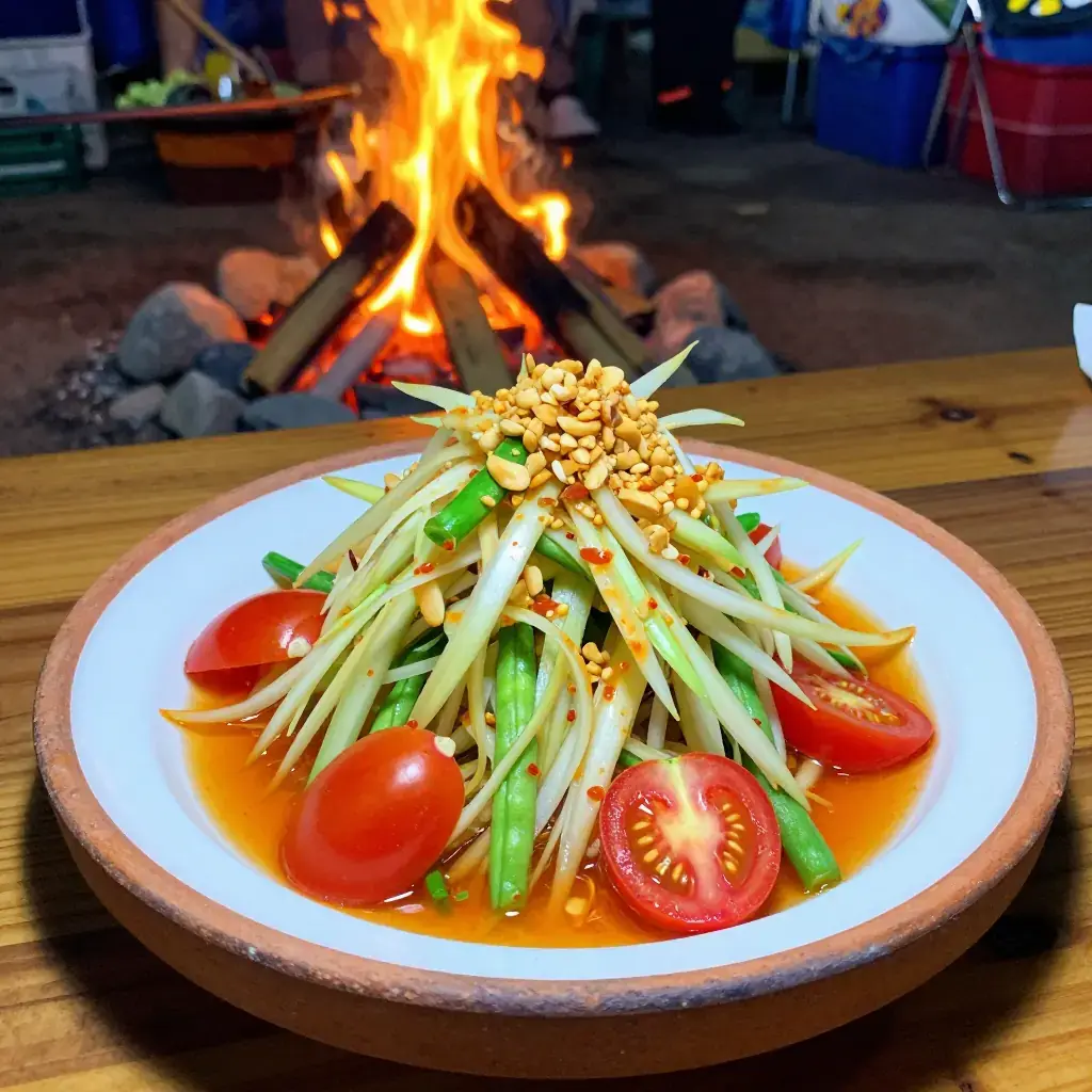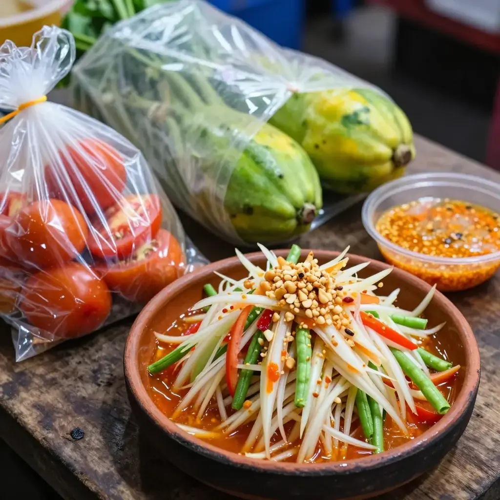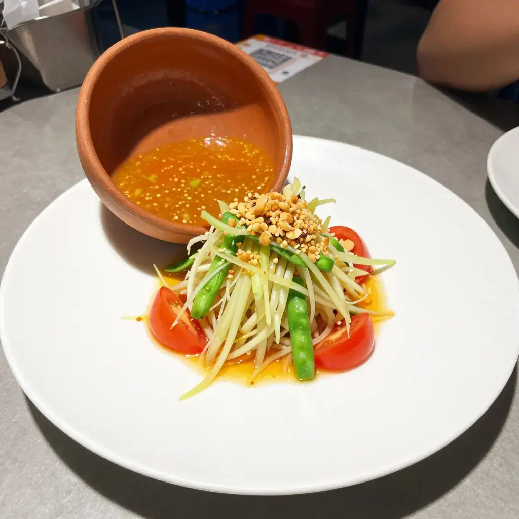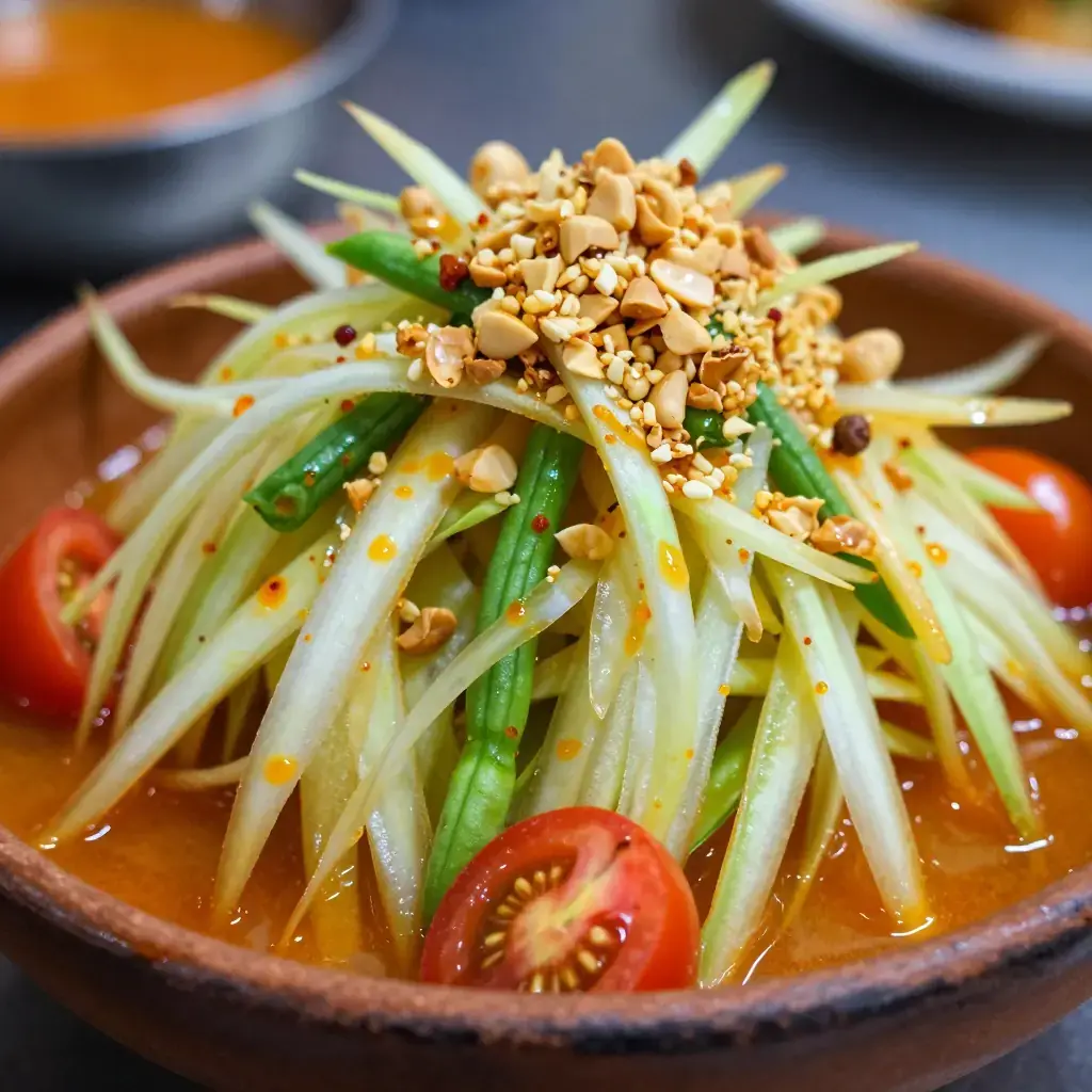 # Som Tam Thai (ส้มตำไทย — Thai Green Papaya Salad with Dried Shrimp) Som Tam Thai is Thailand's most iconic street salad — shredded green papaya pounded in a clay mortar with garlic, chillies, fish sauce, lime, and palm sugar, finished with dried shrimp and roasted peanuts. Originally from the Isaan region and now ubiquitous across Thailand, its layered interplay of sour, sweet, salty, and spicy is unlike anything else. Serves: 4 ## Ingredients - 400g (14 oz) green papaya, peeled and shredded (use a papaya shredder or mandoline) - 2 cups (60g) long beans or green beans, cut into 4cm (1½ in) pieces - 8 cherry tomatoes, halved - 2–4 fresh bird's eye chillies (adjust to heat preference) - 3 cloves garlic - 2 tbsp (20g) dried shrimp - 2 tbsp (20g) roasted peanuts, roughly crushed - 2 tbsp (30ml) fish sauce - 2 tbsp (30ml) fresh lime juice - 1½ tbsp (18g) palm sugar or light brown sugar ## Instructions 1. In a large clay mortar, pound the garlic and bird's eye chillies together until roughly crushed — 5–8 hard pounds. You want texture, not a paste. 2. Add the long beans and pound lightly 3–4 times just to bruise them. 3. Add the dried shrimp and palm sugar, and pound again to break up the shrimp. 4. Add the fish sauce and lime juice. Stir with the pestle and a spoon. 5. Add shredded papaya in two batches, using the pestle to pound and bruise (not obliterate) while turning with a spoon to mix — about 10–15 pounds total. 6. Add cherry tomatoes and press gently to release their juice. 7. Taste and balance: adjust lime for sour, fish sauce for salt, palm sugar for sweet, and chilli for heat. The flavours should be bold and multilayered. 8. Serve immediately, topped with crushed roasted peanuts, alongside sticky rice or fresh vegetables. **Cook's Notes:** A proper clay mortar and pestle produces the best result — it absorbs moisture and creates the characteristic bruised texture. If you lack a mortar, toss and firmly massage the ingredients in a bowl, though the texture will differ.Images