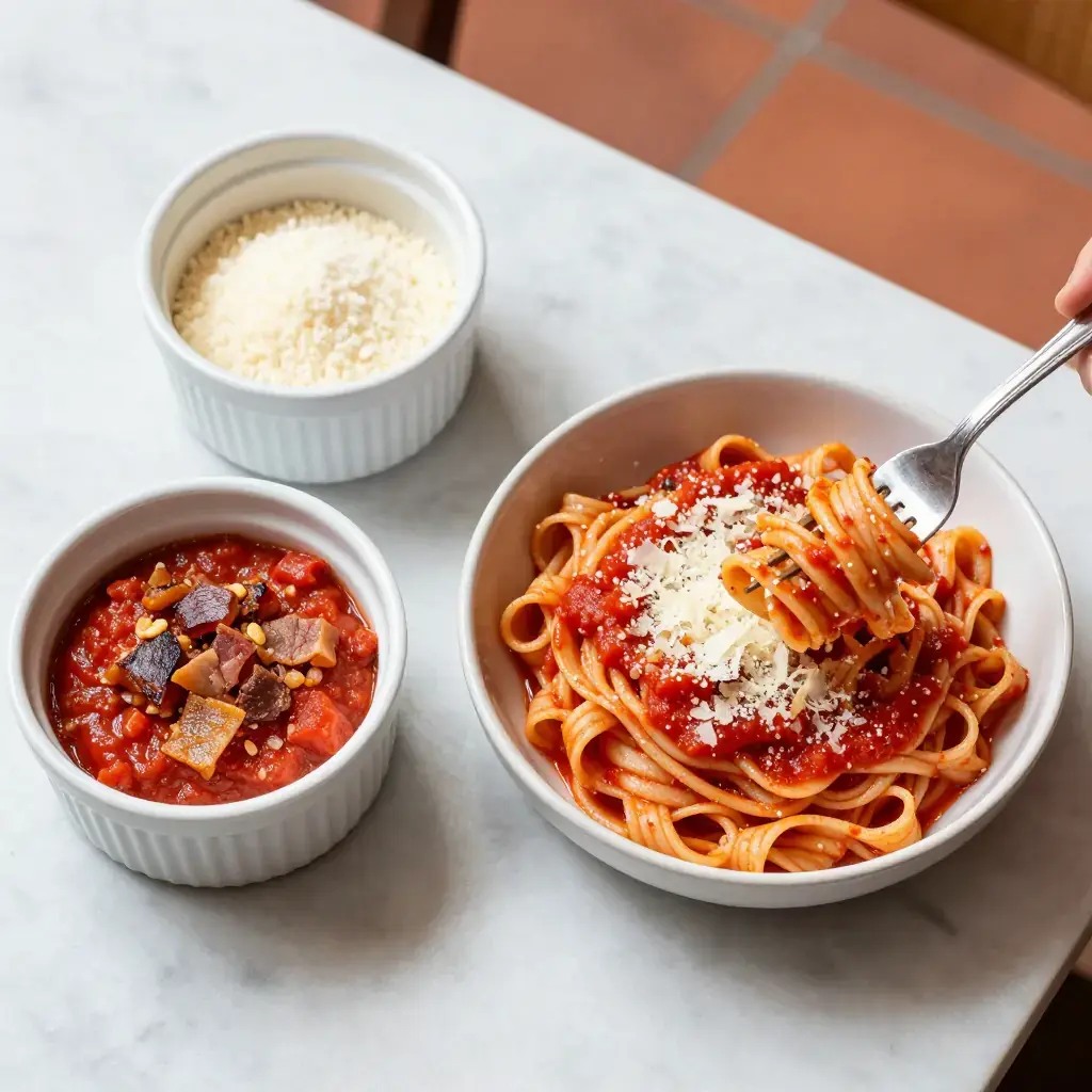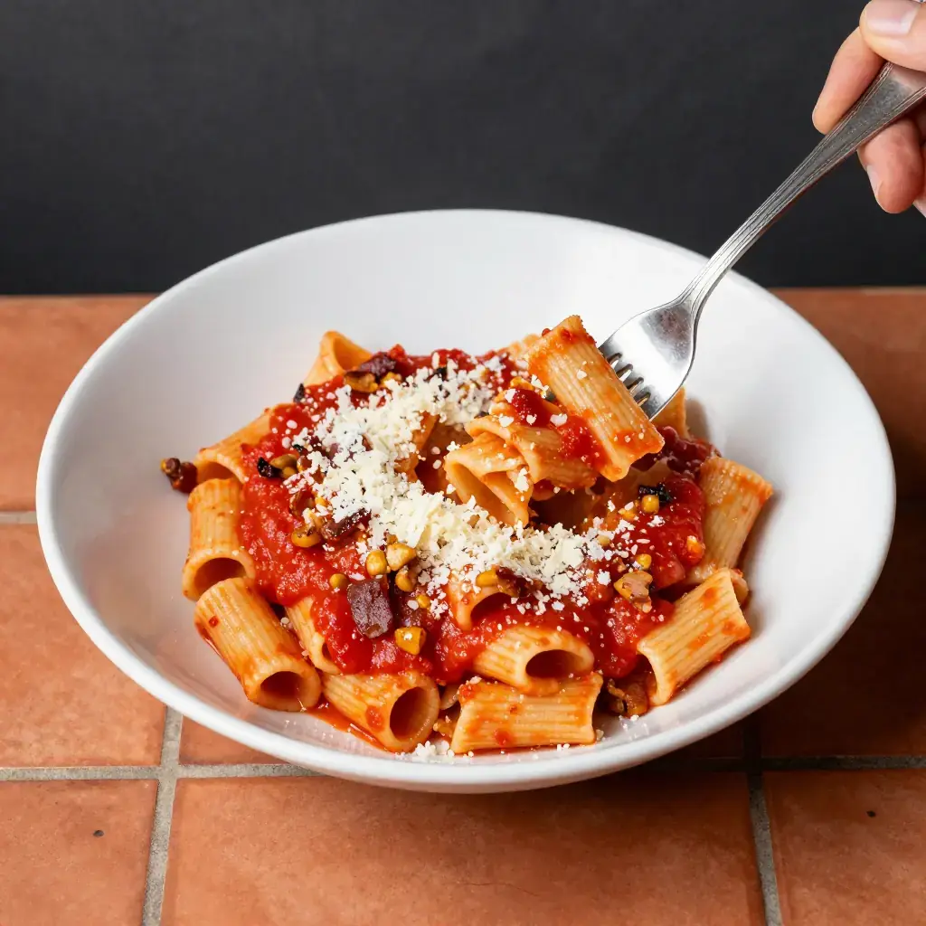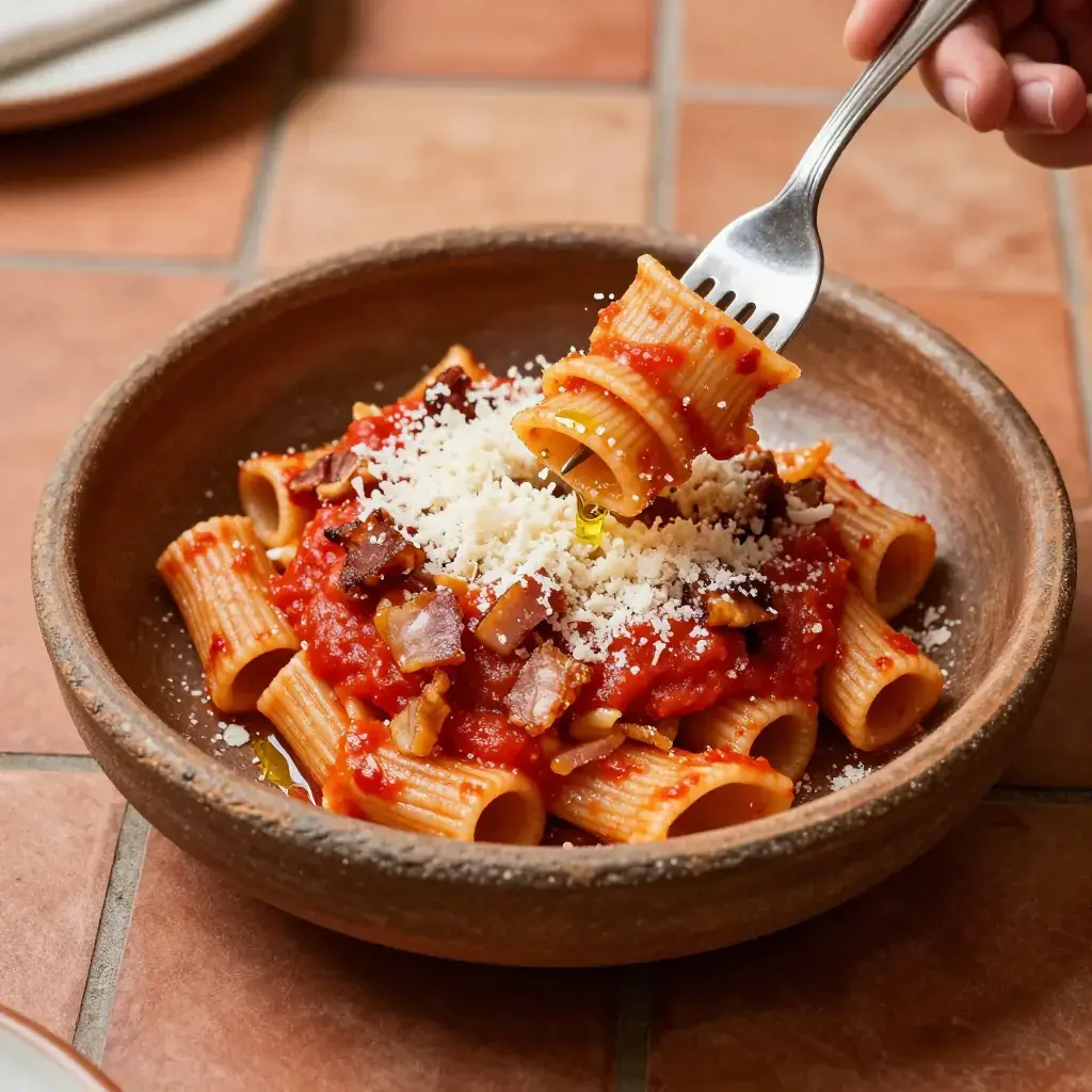 Amatriciana traces its origins to the mountain town of Amatrice, east of Rome in the Lazio-Abruzzo borderlands, where shepherds carried guanciale, pecorino, and pasta on transhumance routes. The original dish was simply pasta with cured pork and cheese — the tomato sauce arrived only after New World ingredients reached Italy in the 18th century. In 2020, Amatriciana was registered as a Traditional Specialty Guaranteed product by the EU, protecting its ingredient list.