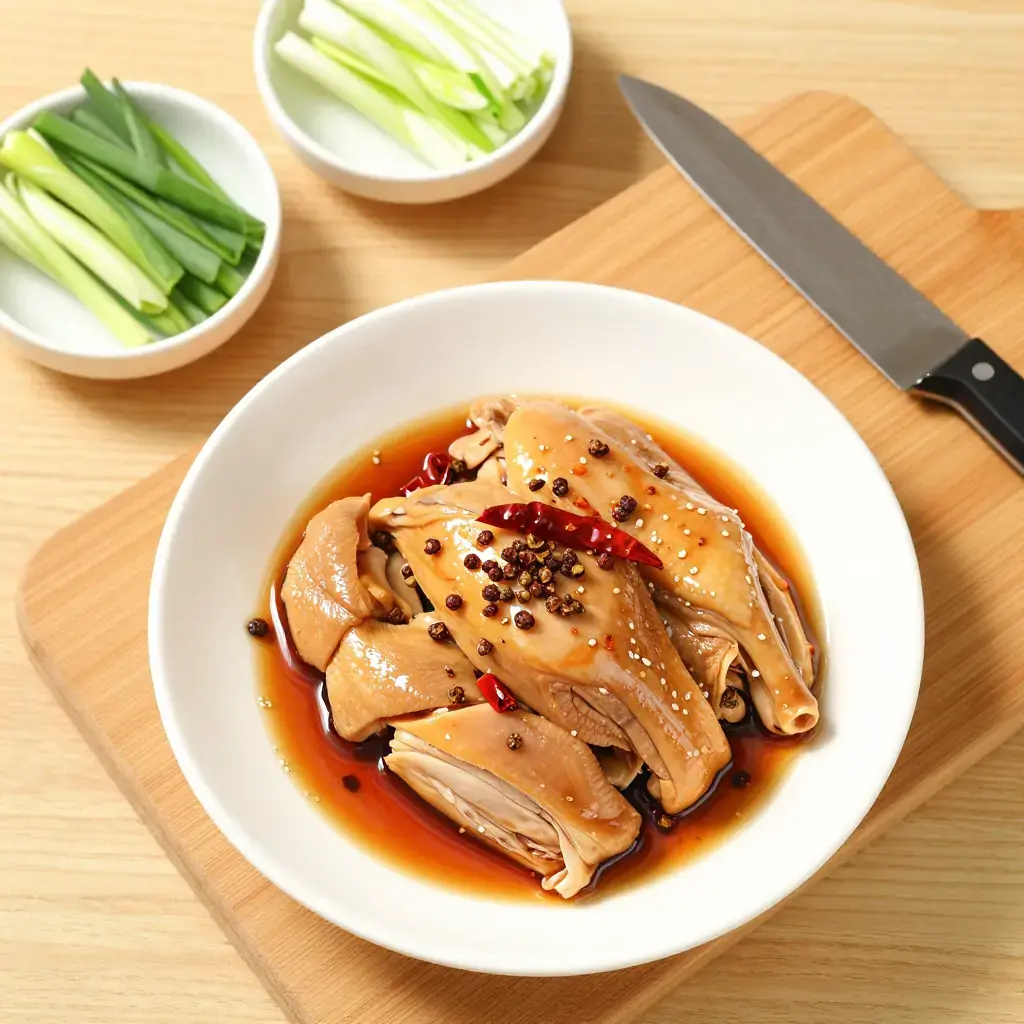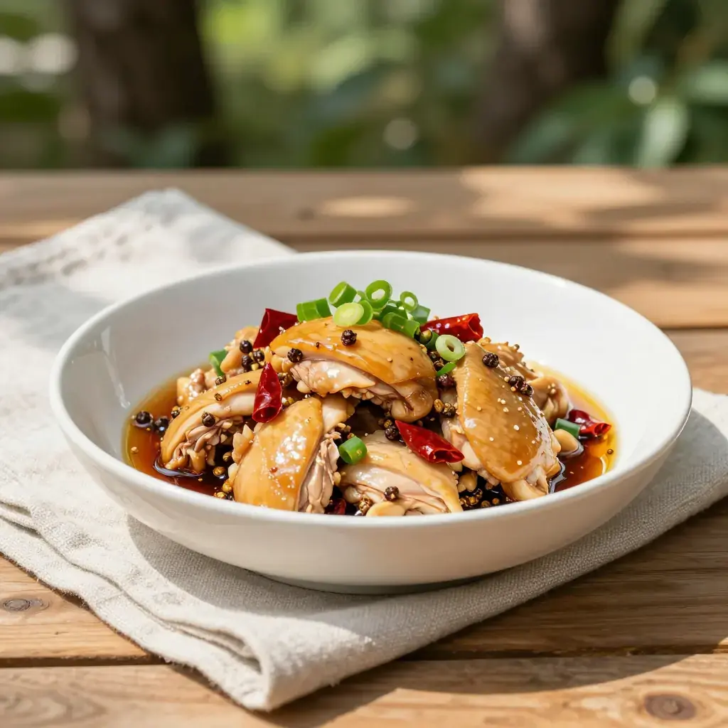 Cook's Notes: The poaching step keeps the chicken supple — do not overcook it at this stage, as the final wok toss finishes the cooking. The balance between the tart vinegar and the numbing Sichuan pepper is key; taste before serving and add more vinegar if the sauce feels flat.