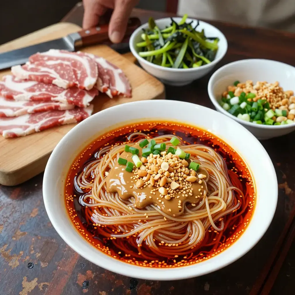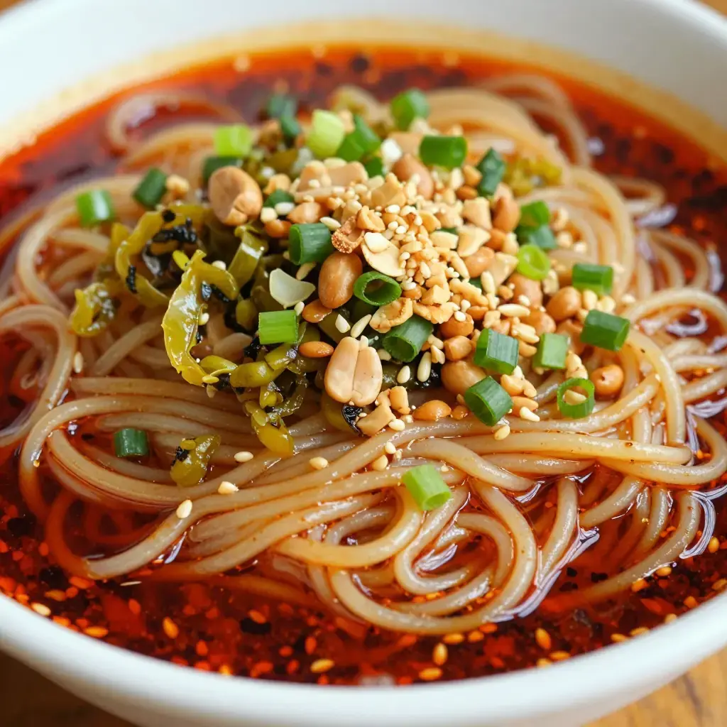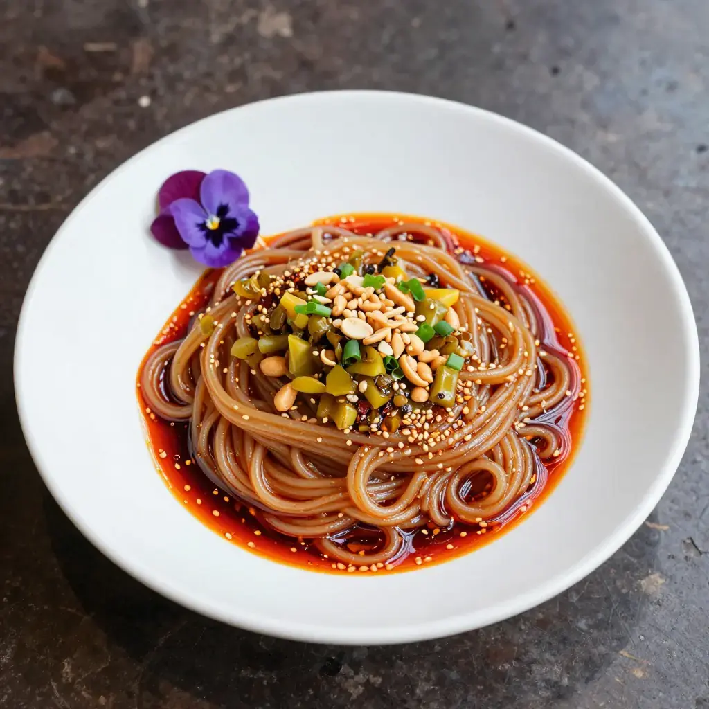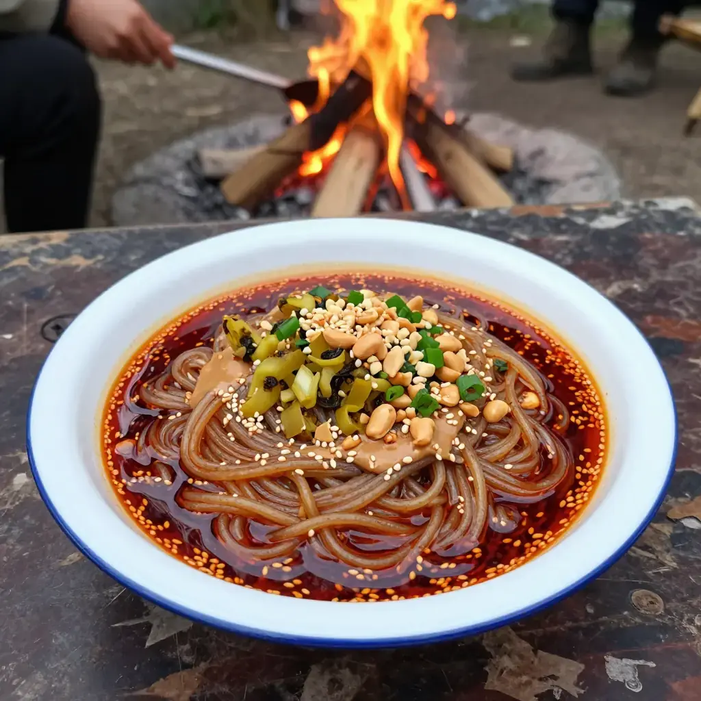 Yibin Ran Mian — "burning noodles" — takes its name from the legend that the thin, oil-dressed strands would ignite if lit with a match, so loaded are they with chilli oil and lard. A Yibin city speciality predating the more famous Dan Dan Mian by centuries, these dry-tossed noodles are served at breakfast at street stalls throughout Sichuan, the noodles dressed with sesame paste, Sichuan chilli oil, preserved Yibin ya cai (mustard greens), peanuts, and spring onion.