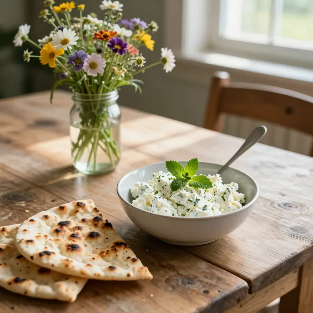 Cook's Notes: The cheese keeps refrigerated for 2–3 days. The jonjoli adds a distinctive pickled bitterness that complements the mild cheese — worth seeking out at Georgian or Middle Eastern grocers.