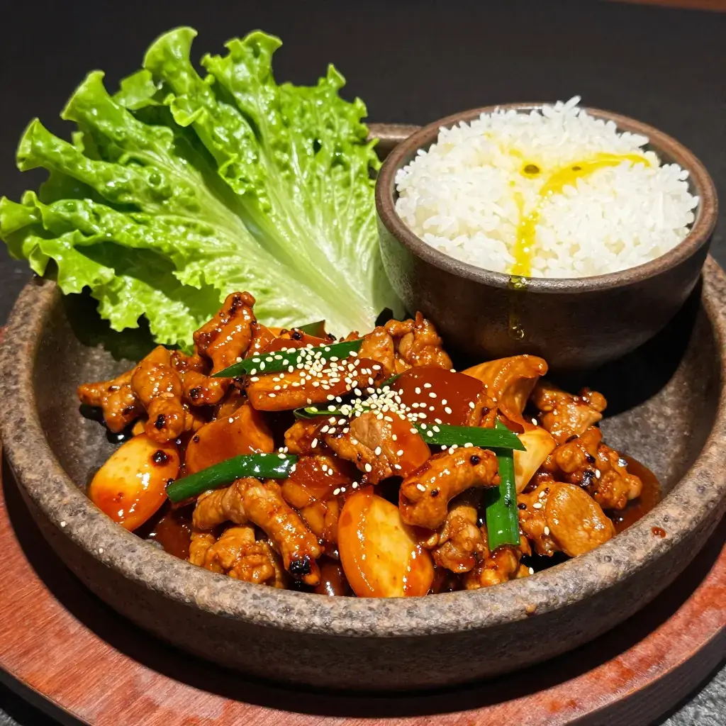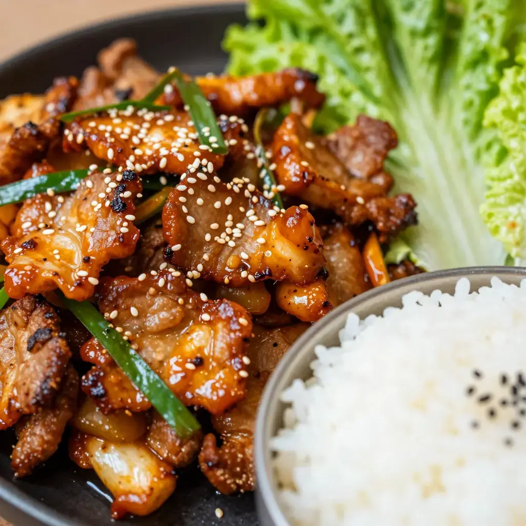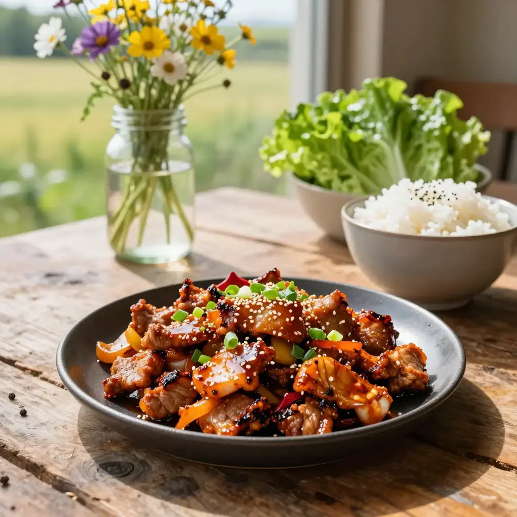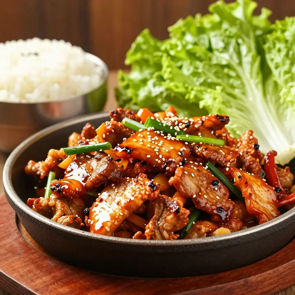 Jeyuk Bokkeum (제육볶음) is Korea's beloved spicy pork stir-fry, one of the most popular everyday dishes on the peninsula. Thin slices of pork belly or shoulder are marinated in a fiery gochujang-based paste with ginger and sesame, then stir-fried at high heat until slightly caramelised and fragrant. It is routinely served over rice and wrapped in lettuce leaves.