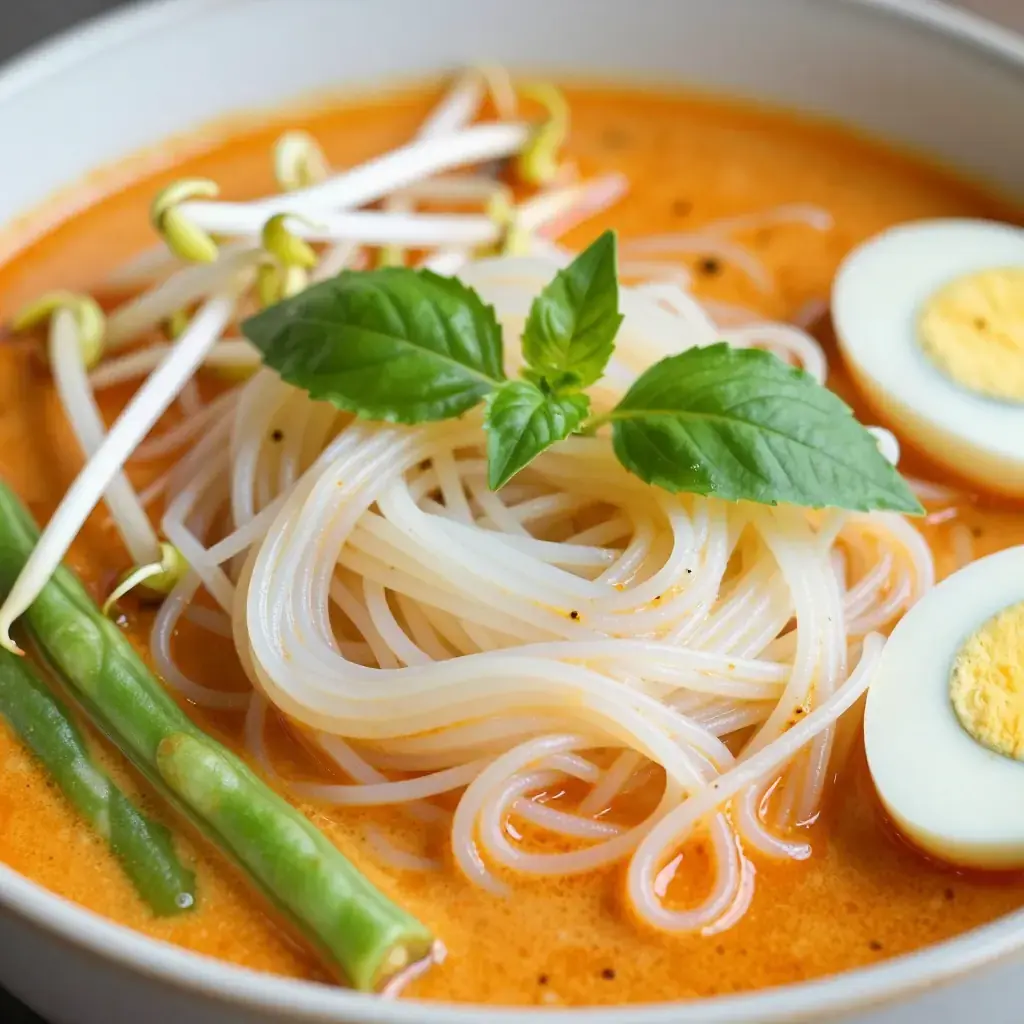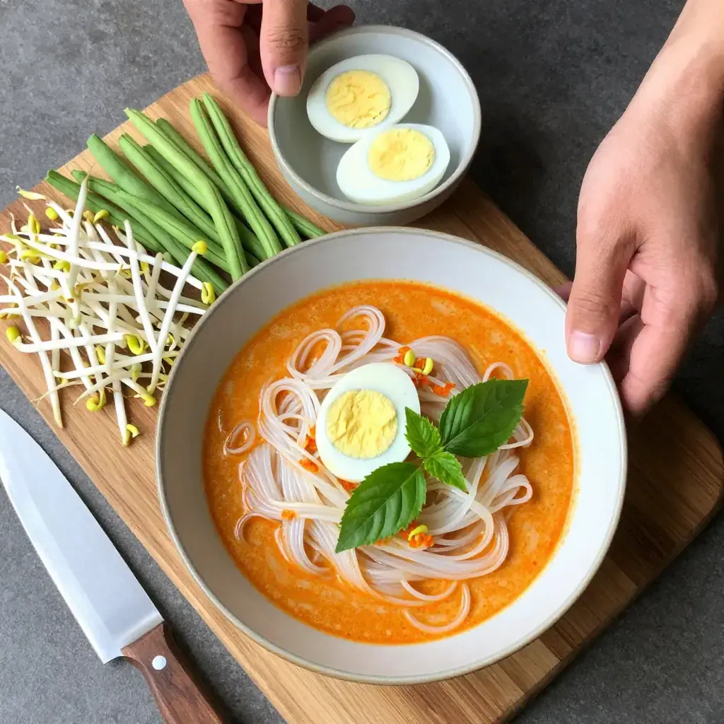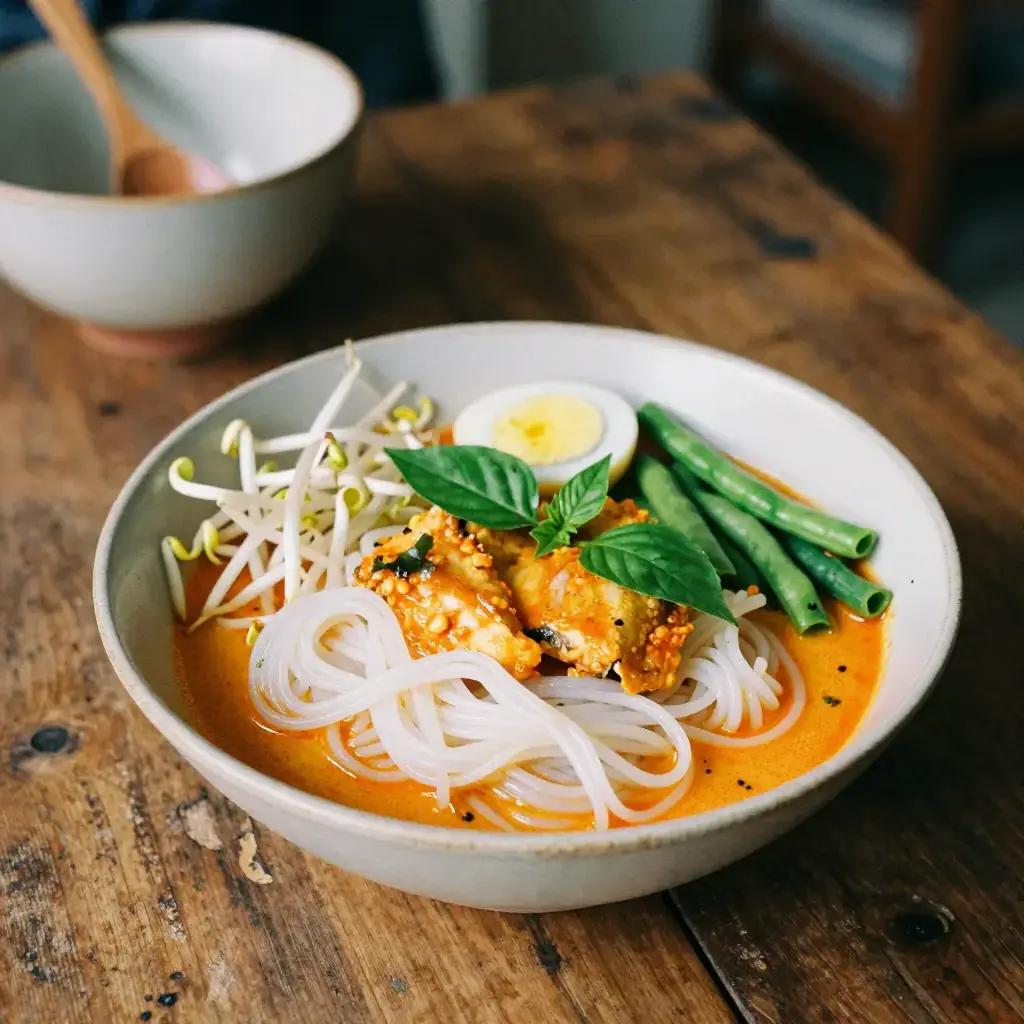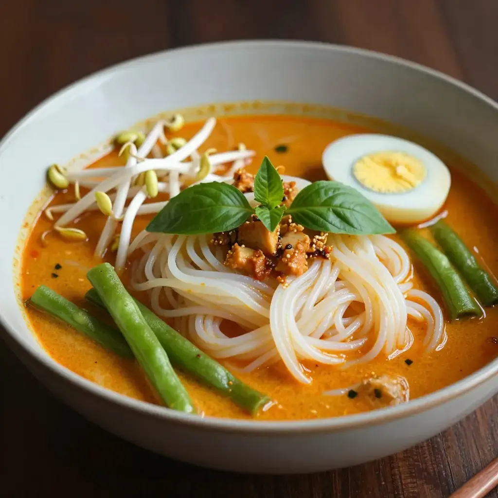 - To serve, arrange a portion of noodles in each bowl. Ladle generous curry sauce over the top. Place alongside bean sprouts, long beans, a halved egg, fresh Thai basil, and sliced kaffir lime leaves for diners to mix in as desired.