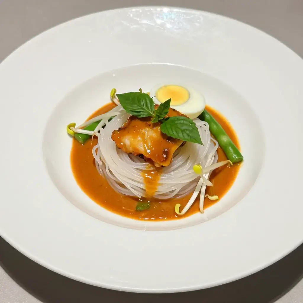 # Khanom Chin Nam Ya Khanom Chin Nam Ya is one of Thailand's oldest dishes — fermented rice noodles served with a fragrant, fish-based curry sauce made from lemongrass, galangal, kaffir lime, and grachai (fingerroot). The noodles themselves are traditionally pressed and fermented, giving them a distinctive soft, slightly sour character that pairs beautifully with the rich, aromatic sauce. The dish is a fixture of Thai temple festivals and communal lunches. Serves: 4 ## Ingredients ### Curry Paste - 4 stalks lemongrass, tender inner part only, sliced - 30g (2-inch piece) fresh galangal, sliced - 30g grachai (fingerroot / krachai), sliced (or extra galangal) - 6 kaffir lime leaves, centre vein removed - 4 dried red chillies, soaked in warm water 10 minutes - 4 shallots, roughly chopped - 4 cloves garlic - 1 tsp shrimp paste (kapi) - 1 tsp salt ### Curry Sauce - 400ml (1¾ cups) coconut milk - 200ml (¾ cup) fish stock or water - 400g (14 oz) firm white fish (snapper or mackerel), steamed and flaked - 2 tbsp (30ml) fish sauce - 1 tsp palm sugar or brown sugar ### To Serve - 500g (1 lb) fresh khanom chin noodles (fermented rice noodles) or cooked thin rice vermicelli - Bean sprouts, blanched - Long beans, blanched and cut into 3cm pieces - Hard-boiled eggs, halved - Fresh Thai basil leaves - Kaffir lime leaves, thinly sliced ## Instructions 1. Using a mortar and pestle (or food processor), pound together lemongrass, galangal, grachai, kaffir lime leaves, soaked chillies, shallots, garlic, shrimp paste, and salt into a fine, fragrant paste. Work in stages, adding harder ingredients first. 2. In a medium saucepan, heat 4 tbsp of the thick coconut cream skimmed from the top of the tin over medium heat for 2–3 minutes until it bubbles and the oil separates. Add the curry paste and fry, stirring constantly, for 4–5 minutes until dark and very fragrant. 3. Add remaining coconut milk and fish stock. Bring to a gentle simmer and cook for 10 minutes. Add the flaked fish and stir to incorporate, breaking it into fine shreds so it thickens the sauce. Simmer 8–10 minutes more until the sauce is rich and slightly thickened. 4. Season with fish sauce and palm sugar. The sauce should be savoury, faintly sweet, and deeply aromatic. Adjust to taste. 5. To serve, arrange a portion of noodles in each bowl. Ladle generous curry sauce over the top. Place alongside bean sprouts, long beans, a halved egg, fresh Thai basil, and sliced kaffir lime leaves for diners to mix in as desired. **Cook's Notes:** Grachai (fingerroot) is essential for the authentic flavour of Nam Ya; find it frozen at Asian grocery stores. The sauce thickens considerably as it cools — add a splash of coconut milk when reheating.Images