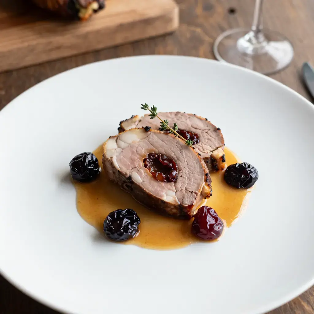 This slow-braised pork roast studded with prunes is a treasured dish from the Loire Valley, where the finest pruneaux d'Agen grow alongside the river. The fruit melts into the braising juices to create a silky, sweet-savory sauce that is quintessentially French home cooking.