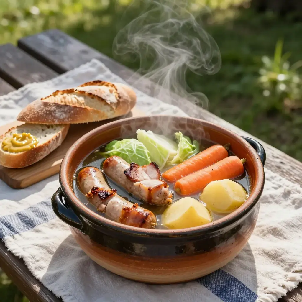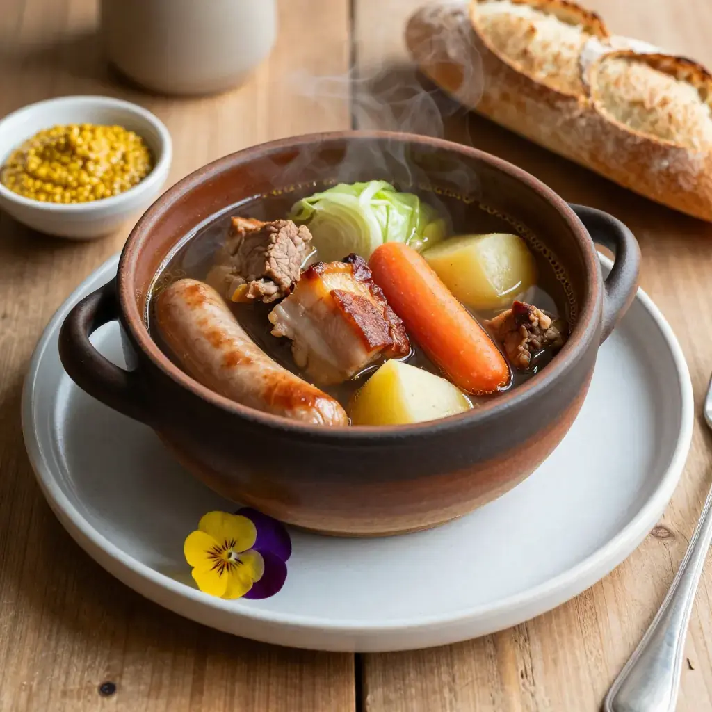 - Serve in deep bowls: place the vegetables and meats together, ladle broth over generously, and offer mustard and crusty bread alongside.