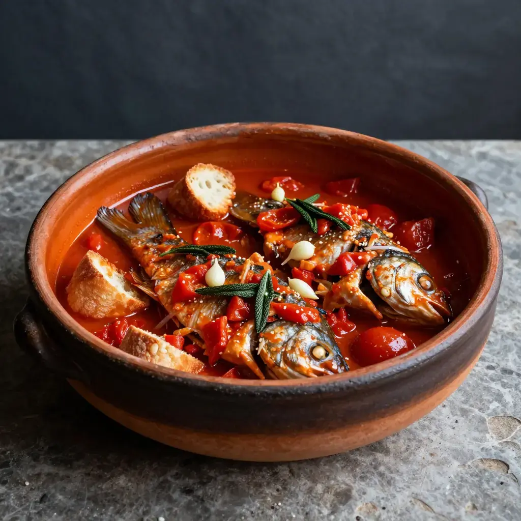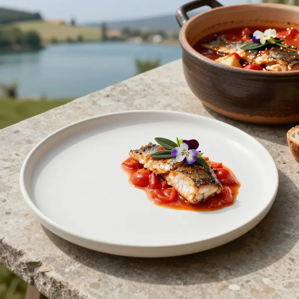 # Tegamaccio del Trasimeno Tegamaccio is the ancient fisherman's stew of Lake Trasimeno in landlocked Umbria, one of Italy's last great freshwater fishing traditions. The name comes from tegame (earthenware pan), and the dish combines several local fish braised together with white wine, tomatoes, and sage into a deeply flavoured, restorative pot that has sustained fishing families for centuries. Serves: 4 ## Ingredients - 1.2 kg (2.6 lb) mixed freshwater fish (carp, perch, pike, tench), cleaned and cut into large pieces — or substitute saltwater fish such as sea bream, mullet, and bass - 1 medium onion, finely sliced - 4 cloves garlic, sliced - 4 ripe plum tomatoes (or 200 g / 7 oz canned), roughly chopped - 150 ml (⅔ cup) dry white wine - 4 tbsp (60 ml) extra-virgin olive oil - 8 fresh sage leaves - 1 sprig fresh rosemary - 1 dried red chilli, crumbled - Salt and black pepper to taste - Small bunch flat-leaf parsley, chopped - 4 thick slices Umbrian-style bread (or sourdough), toasted and rubbed with garlic ## Instructions 1. Season the fish pieces generously with salt and pepper. In a wide, heavy earthenware pot or casserole, warm the olive oil over medium heat. 2. Gently fry the onion for 8–10 minutes until soft and translucent. Add the garlic, sage, rosemary, and crumbled chilli; cook 2 minutes until fragrant. 3. Add the white wine and simmer for 3 minutes to evaporate the alcohol. 4. Add the tomatoes and cook, stirring occasionally, for 10 minutes until they break down into a rough sauce. 5. Arrange the fish pieces in a single layer over the sauce. The thicker, firmer pieces (carp or bass) go in first; add the more delicate pieces on top. 6. Cover and braise over low heat for 25–30 minutes without stirring — the fish should fall apart gently in the sauce. Carefully check for doneness after 20 minutes. 7. Scatter the chopped parsley over the top. Taste and adjust salt. 8. Place a piece of garlic-rubbed toast in each wide bowl, spoon the stew over generously, and serve immediately. **Cook's Notes:** The tradition is to use local Trasimeno lake fish, but any combination of firm-fleshed fish works beautifully. Avoid fragile fish that will disintegrate completely. Do not stir once the fish is added — the tegamaccio is meant to be served in large pieces, not shredded.Images