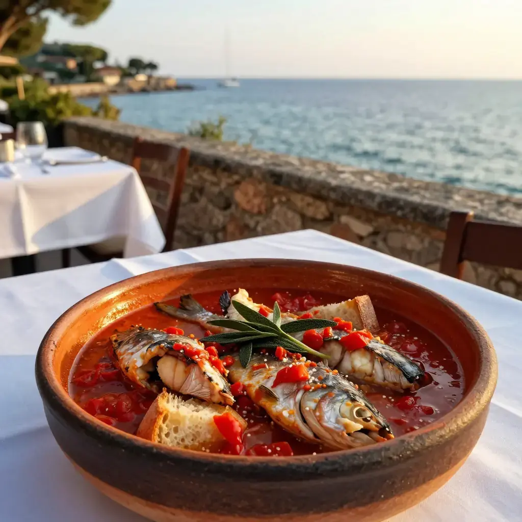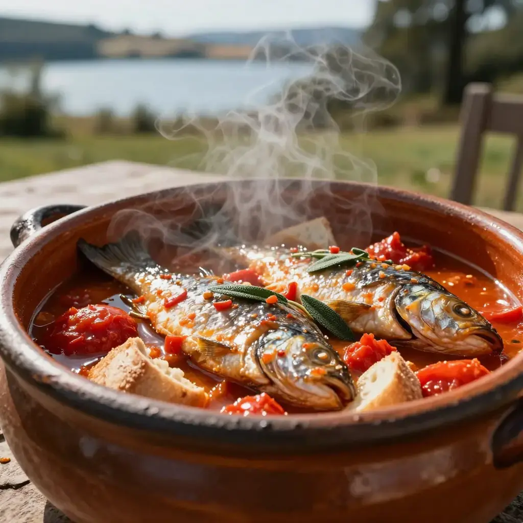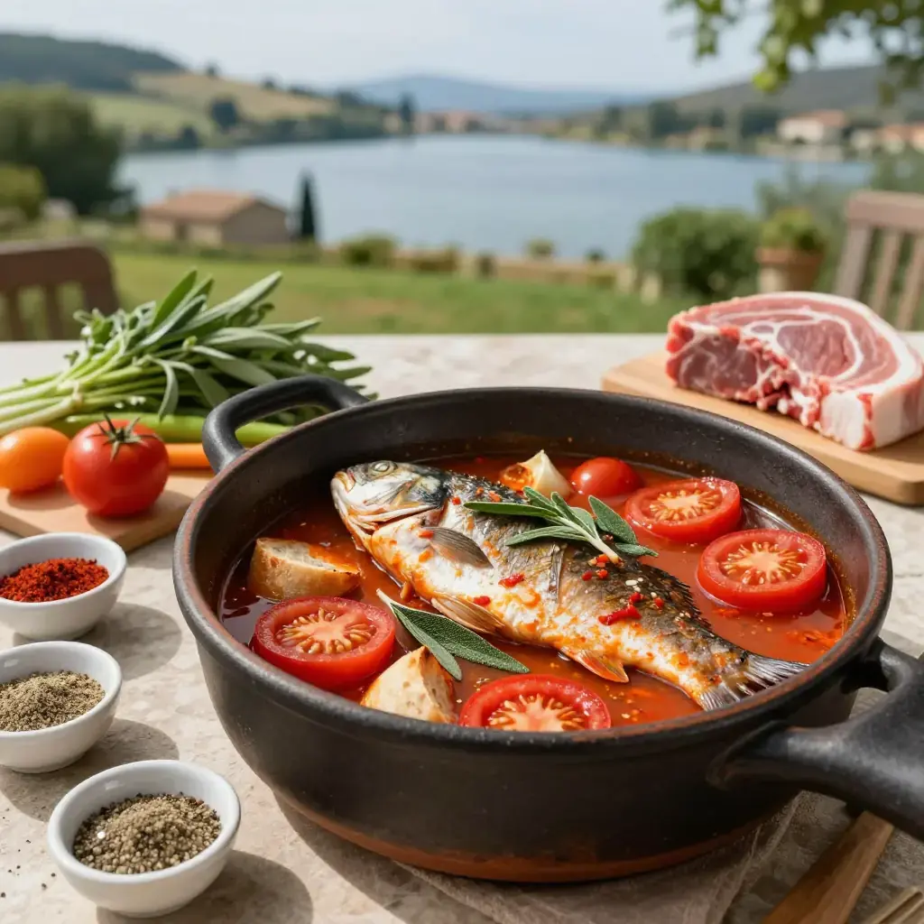 Tegamaccio is the ancient fisherman's stew of Lake Trasimeno in landlocked Umbria, one of Italy's last great freshwater fishing traditions. The name comes from tegame (earthenware pan), and the dish combines several local fish braised together with white wine, tomatoes, and sage into a deeply flavoured, restorative pot that has sustained fishing families for centuries.