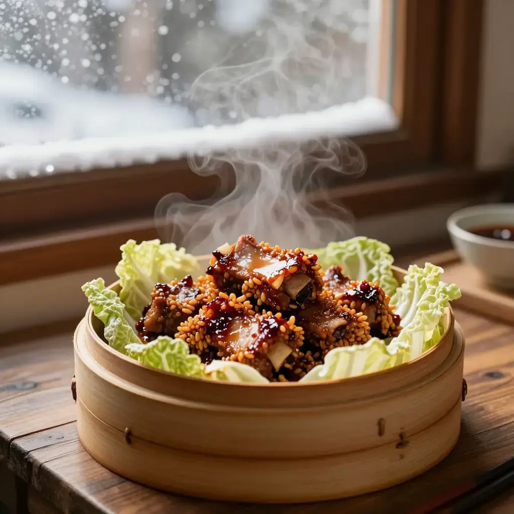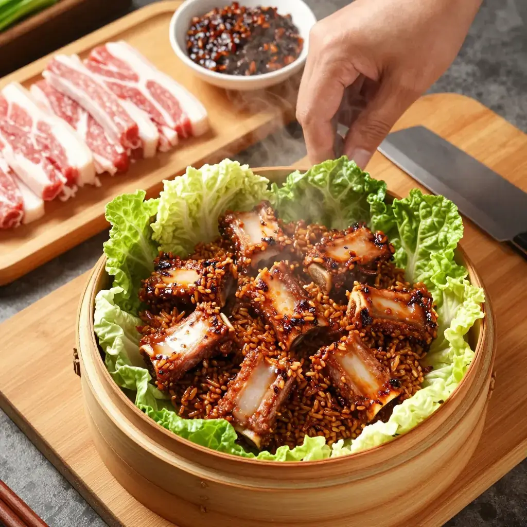 - Arrange the coated ribs in a single layer in a steamer basket lined with napa cabbage leaves or baking paper.