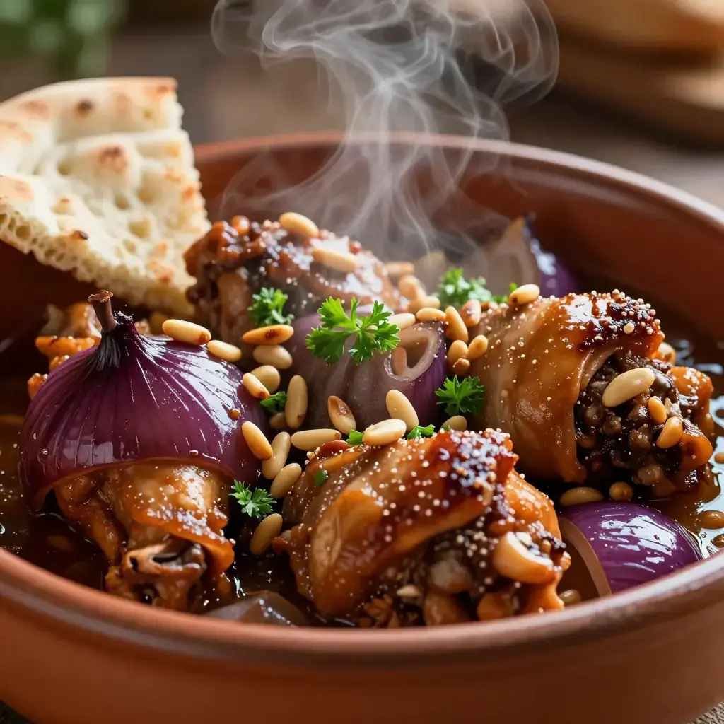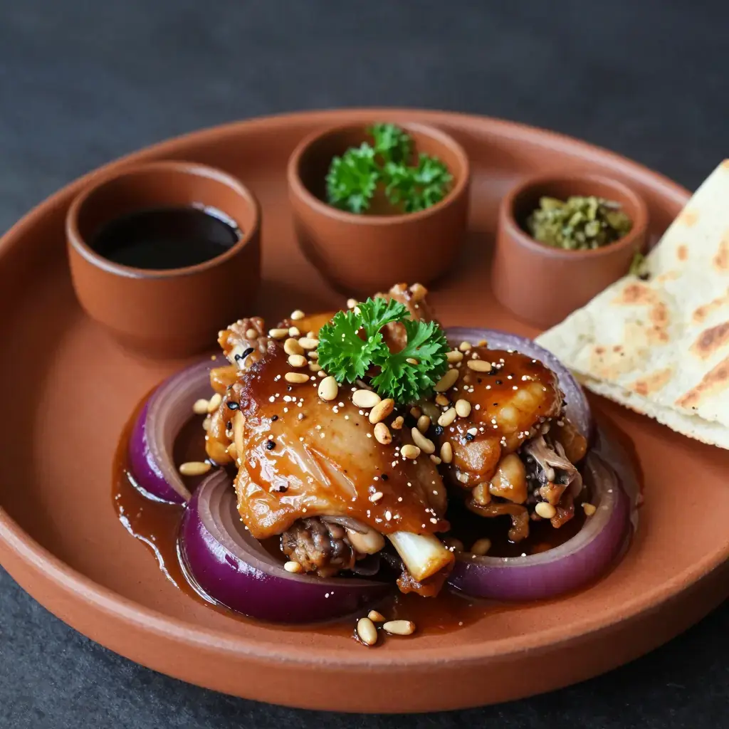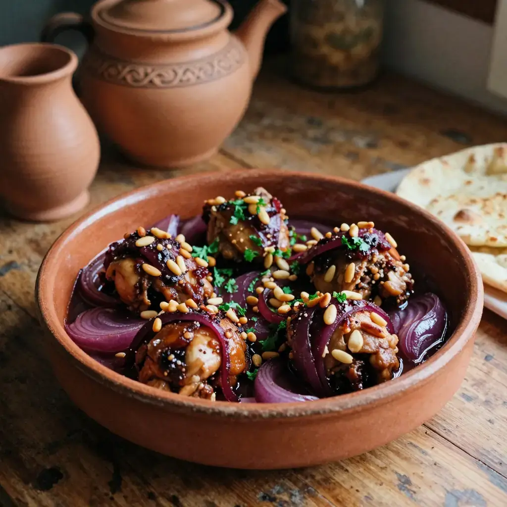 # Djaj bi Sumac wa Basal This beautiful dish from the Lebanese mountains relies on the tangy, wine-dark spice sumac to braise chicken thighs into something extraordinary. The onions melt into a jammy sauce that is simultaneously sour, sweet and deeply savoury — perfect spooned over warm flatbread or rice. It is a staple of home cooking and mezze feasts from Tripoli to the Bekaa Valley. Serves: 4 ## Ingredients - 1kg (2.2 lb) bone-in skin-on chicken thighs - 4 large onions, halved and thinly sliced - 60ml (¼ cup) olive oil - 3 tbsp (30g) ground sumac, divided - 1 tsp ground allspice - 1 tsp ground cinnamon - ½ tsp ground black pepper - 1 tsp salt - 100ml (scant ½ cup) pomegranate juice or water - 2 tbsp (20g) toasted pine nuts, to garnish - Fresh flat-leaf parsley, chopped, to garnish - Khubz (flatbread) or vermicelli rice, to serve ## Instructions 1. In a bowl, toss chicken with 1.5 tbsp sumac, allspice, cinnamon, black pepper and salt. Let marinate at least 30 minutes (or overnight in the fridge). 2. Heat olive oil in a large heavy-based pan over medium-high heat. Brown the chicken skin-side down for 5-6 minutes until golden and crisp. Flip and brown the other side 3-4 minutes. Remove and set aside. 3. Reduce heat to medium. Add onions to the same pan (do not clean it). Cook 20-25 minutes, stirring every few minutes, until deeply golden and soft. 4. Stir in remaining 1.5 tbsp sumac and cook 2 minutes. 5. Nestle the chicken back into the onion mixture. Add pomegranate juice or water. Cover and braise over low heat for 25-30 minutes until chicken is completely tender and cooked through. 6. Remove lid and cook a further 5 minutes to reduce and concentrate the sauce. 7. Serve scattered with toasted pine nuts and fresh parsley. **Cook's Notes:** Sumac is the star — use the freshest you can find, ideally bought from a Middle Eastern grocer. The dish can be made a day ahead and tastes even better reheated. A drizzle of pomegranate molasses at the end adds extra depth.Images