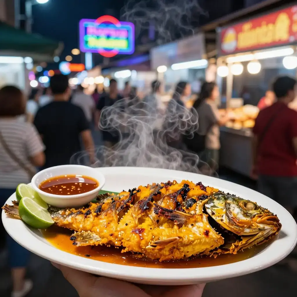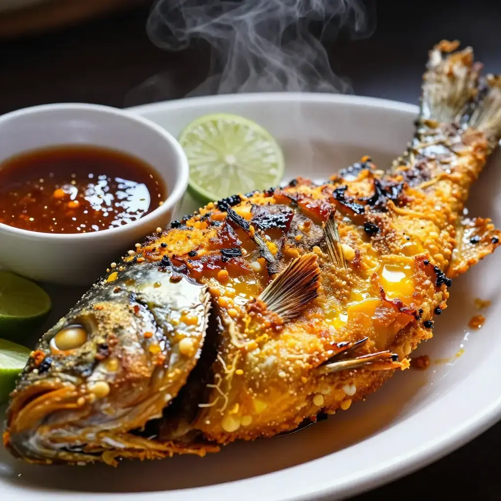 Pla Thod Kamin is a beloved southern Thai street dish of whole fish marinated in golden turmeric and garlic, then deep-fried until the skin turns shatteringly crisp. It is sold at roadside stalls throughout the Thai south, served with a fiery nam prik kapi dipping sauce.