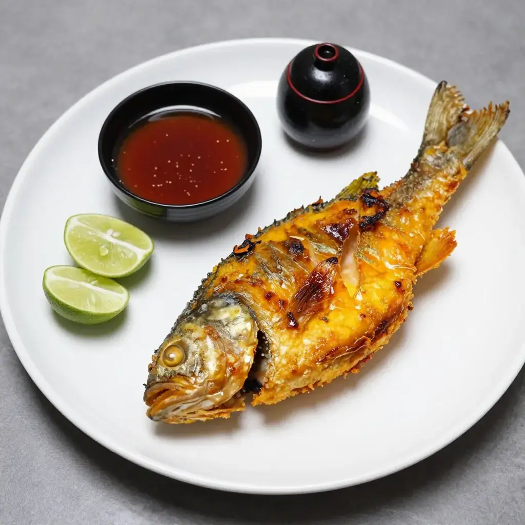 # Pla Thod Kamin Pla Thod Kamin is a beloved southern Thai street dish of whole fish marinated in golden turmeric and garlic, then deep-fried until the skin turns shatteringly crisp. It is sold at roadside stalls throughout the Thai south, served with a fiery nam prik kapi dipping sauce. Serves: 4 ## Ingredients - 2 whole sea bass or tilapia, about 500g (1 lb) each, cleaned and scored - 4 cloves garlic, minced - 2 tsp (10g) ground turmeric - 1 tsp (5g) white pepper - 1 tsp (5g) salt - 1 tbsp (15ml) fish sauce - Vegetable oil for deep-frying **Nam Prik Kapi dipping sauce:** - 1 tbsp (15g) shrimp paste (kapi), toasted - 3 bird's eye chilies, pounded - 2 cloves garlic, pounded - 1 tbsp (15ml) lime juice - 1 tsp (5g) palm sugar - 1 tbsp (15ml) fish sauce ## Instructions 1. Combine garlic, turmeric, white pepper, salt, and fish sauce into a paste. Rub all over the fish and into the score marks. Marinate for 30 minutes at room temperature. 2. Heat vegetable oil in a wok or deep pan to 180°C (350°F) — enough to submerge the fish. 3. Carefully lower one fish into the hot oil. Fry for 8–10 minutes, turning once, until deep golden and cooked through. Drain on a rack. 4. Repeat with the second fish, returning oil to temperature between batches. 5. Make the dipping sauce: pound shrimp paste, chilies, and garlic in a mortar. Add lime juice, palm sugar, and fish sauce; stir to dissolve. 6. Serve the fish whole on a platter with steamed jasmine rice and the dipping sauce on the side. **Cook's Notes:** Scoring the fish deeply helps the turmeric marinade penetrate and ensures even frying. The skin must be completely dry before it enters the oil — pat with paper towels after marinating. For extra crunch, dust lightly with rice flour before frying.Images
