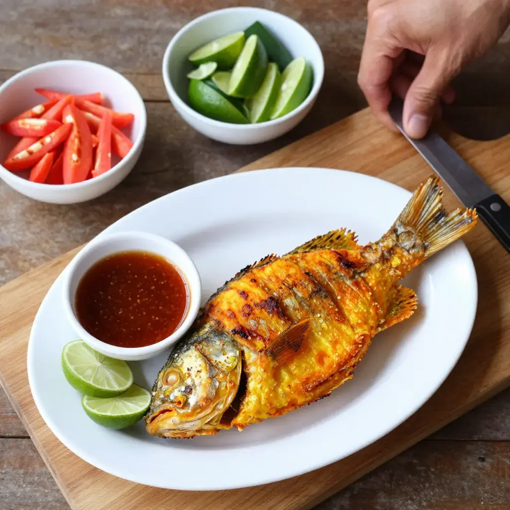 Cook's Notes: Scoring the fish deeply helps the turmeric marinade penetrate and ensures even frying. The skin must be completely dry before it enters the oil — pat with paper towels after marinating. For extra crunch, dust lightly with rice flour before frying.