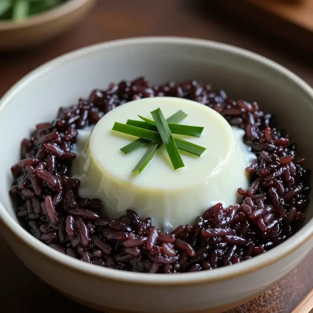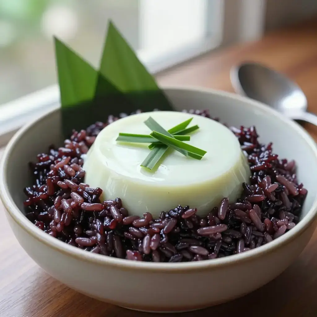 - Serve chilled black rice in bowls, topped with slices of cold sang kaya custard.