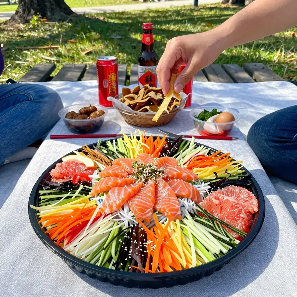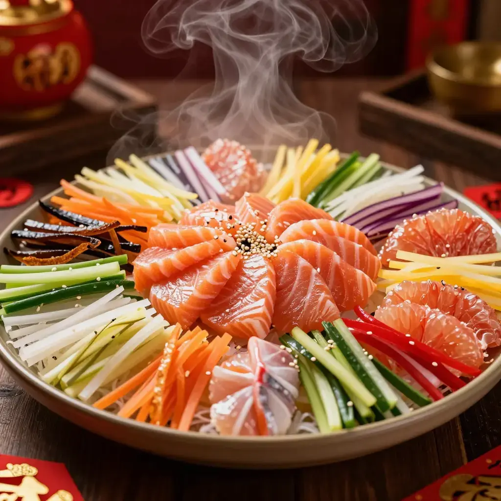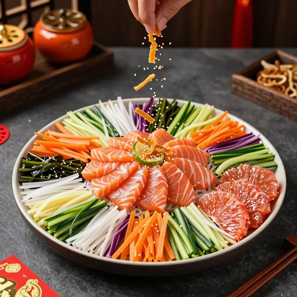 Yu Sheng — also known as lo hei — is a Cantonese raw fish salad originating in Guangdong and elevated to an elaborate ritual in Singapore and Malaysia. Thin slices of fresh raw fish are arranged over a mosaic of shredded vegetables, pickles, and crispy wonton strips, then dressed with plum sauce and sesame oil. The dish is tossed communally at the table with chopsticks raised high, each ingredient symbolising a different New Year's wish.