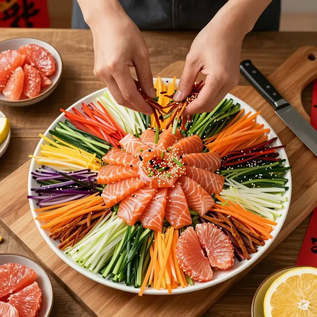 Cook's Notes: The fish must be sashimi-grade and kept refrigerated until the moment of plating. Prepare all vegetables up to a day ahead and store in ice water; drain and dry thoroughly before plating. In the original Guangdong tradition, freshwater carp was used — salmon became standard in Singapore from the 1960s onwards.