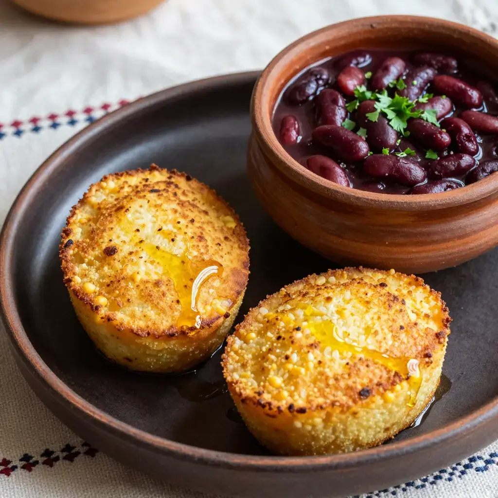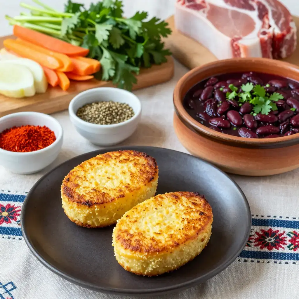 Mchadi is the ancient cornerstone of Georgian peasant cooking — a dense, unleavened cornbread cooked in a dry pan that has sustained farmers and shepherds through hard mountain winters for centuries. It is almost always paired with lobio, a boldly spiced kidney bean stew. Together they form one of the most satisfying and complete vegetarian meals in the Georgian culinary canon, rich in plant protein and fibre.