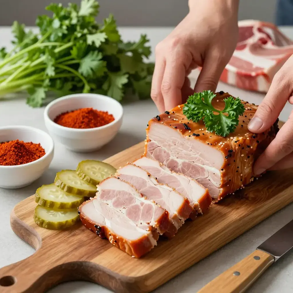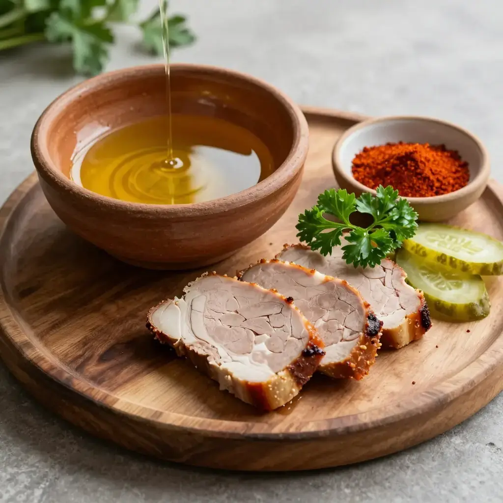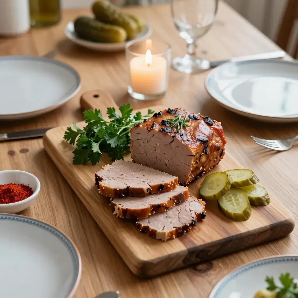 # Svinjski Svarz Svarz is a beloved cold-cut tradition in Vojvodina, Serbia's northern plains, where smoking and preserving every part of the pig has been a way of life for centuries. This pressed terrine of smoked pork offal and meat is sliced thin and served with pickled vegetables and crusty bread at festive gatherings. Serves: 8 ## Ingredients - 500g (1 lb) smoked pork ears, cleaned - 300g (10 oz) smoked pork snout - 200g (7 oz) smoked pork tongue - 200g (7 oz) smoked pork skin - 4 cloves garlic, minced - 1 tsp (5ml) black peppercorns, whole - 1 tsp (5ml) ground sweet paprika - 1/2 tsp (2.5ml) ground allspice - 2 bay leaves - 1 medium onion, halved - Salt to taste - Fresh parsley, chopped, for serving - Sliced pickled cucumbers, for serving ## Instructions 1. Rinse all smoked offal pieces thoroughly under cold water. Place in a large pot with the halved onion, bay leaves, and peppercorns. Cover with cold water and bring to a boil. 2. Skim off any foam, then reduce to a low simmer. Cook uncovered for 2.5–3 hours until all pieces are very tender when pierced with a knife. 3. Remove the offal and reserve 250ml (1 cup) of the strained cooking broth. Allow the offal to cool slightly until handle-able. 4. Peel the tongue. Finely dice or shred all the cooked offal pieces and skin into small, even pieces. Discard bones. 5. Mix the shredded meat with garlic, paprika, allspice, and enough reserved broth to moisten — about 4–5 tbsp. Taste and adjust salt. 6. Pack firmly into a loaf pan lined with plastic wrap. Pour any remaining broth over the top. Fold over the plastic wrap and place a heavy weight on top. 7. Refrigerate for at least 8 hours or overnight until fully set and sliceable. 8. Unmold, slice thinly, and arrange on a platter with chopped parsley and pickled cucumbers. **Cook's Notes:** The quality of smoked offal matters greatly — seek out a butcher who cold-smokes with beechwood. Svarz keeps refrigerated for up to 5 days. Serve with rakija (plum brandy) for an authentic Vojvodina experience.Images