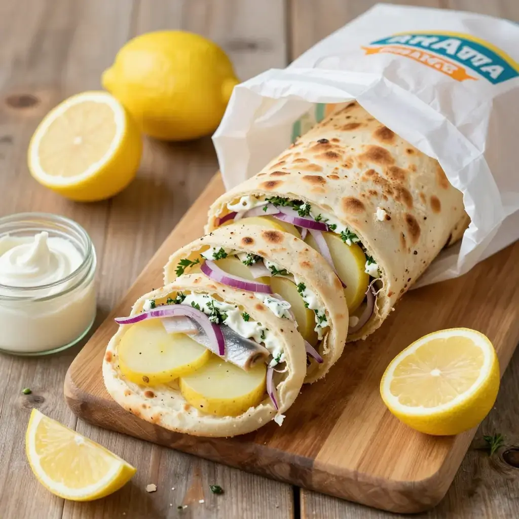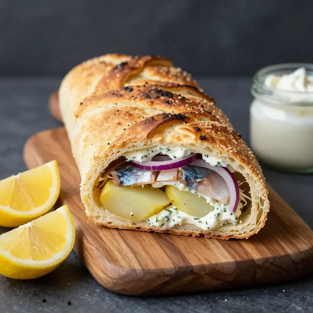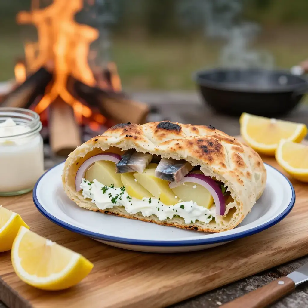 # Surströmming Tunnbrödsrulle Surströmming — Swedish fermented Baltic herring — is one of Scandinavia's most notorious delicacies, cured for months until it develops a pungent, intensely savoury character. The tunnbrödsrulle, a softened flatbread roll loaded with fermented herring, potatoes, onion, and soured cream, is the traditional way to tame and celebrate its bold flavour. Serves: 4 ## Ingredients - 1 can (440g / 15 oz) surströmming, drained outdoors - 4 large sheets mjukt tunnbröd (soft Swedish flatbread) - 400g (14 oz) waxy potatoes, boiled and sliced - 1 small red onion, very finely diced - 1 small white onion, very finely diced - 200ml (3/4 cup) gräddfil or soured cream - 2 tbsp (30ml) finely chopped fresh dill - 2 tbsp (30ml) finely chopped fresh chives - 1 tbsp (15ml) Dijon or Swedish mild mustard - Butter, for spreading - Lemon wedges, for serving ## Instructions 1. Open the surströmming can outdoors or with strong ventilation. Rinse the fillets gently under cold running water, then remove any bones. Pat dry and set aside. 2. Boil potatoes until tender, about 15–18 minutes. Drain, cool slightly, and slice into 5mm (1/4 inch) rounds. 3. Mix gräddfil with mustard, dill, and chives in a small bowl to make a herb cream. 4. Lay a sheet of tunnbröd flat on a clean surface. Spread a thin layer of butter across the whole surface, then spread 3–4 tbsp of the herb cream. 5. Arrange potato slices in a line near one edge. Lay 2–3 herring fillets on top. Scatter both onions generously over the herring. 6. Roll firmly from the filled edge into a tight cylinder. Repeat with remaining flatbreads and fillings. 7. Serve immediately with lemon wedges, extra herb cream on the side, and cold beer or aquavit. **Cook's Notes:** The fermented aroma of surströmming softens considerably when combined with the cooling cream and sweet potato — first-timers are often surprised by how approachable it becomes. Tunnbröd can be found at Scandinavian specialty stores. If unavailable, soft flour tortillas make a passable substitute.Images