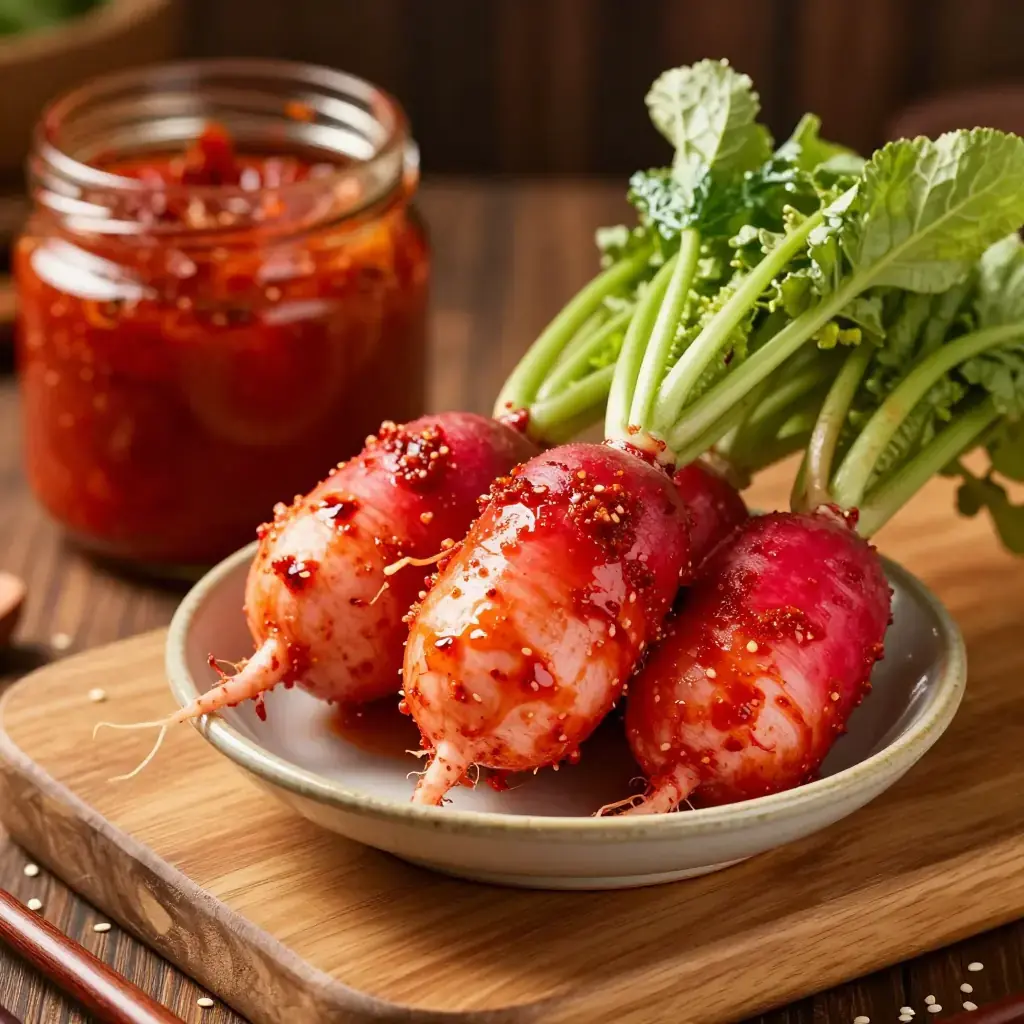 Cook's Notes: Chonggak mu (young ponytail radishes) are available in Korean grocery stores in autumn and spring. Small daikon or French breakfast radishes with their tops can substitute. The greens contribute an important fermented texture — do not discard them.
