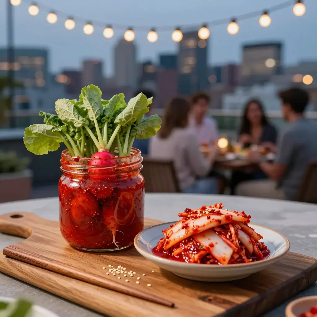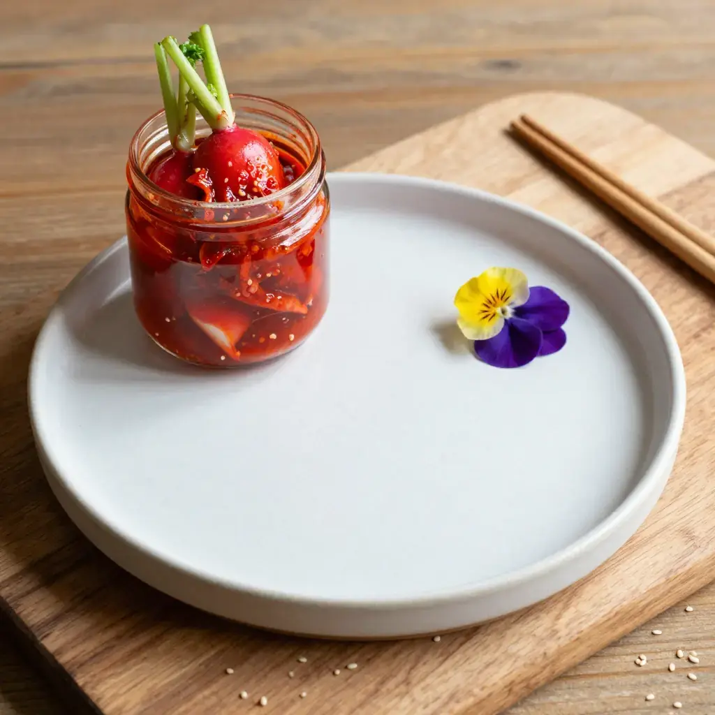 Chonggak kimchi is named for the chonggak — the traditional topknot hairstyle — because the bundles of small whole radishes with their green tops resemble this style when tied together. These young ponytail radishes (chonggak mu) are fermented whole with their greens attached, creating a kimchi with dual textures: crisp, peppery radish and tender, slightly slimy fermented greens. It is one of the most beloved banchan in Korea and a staple of autumn kimjang (kimchi-making) season.