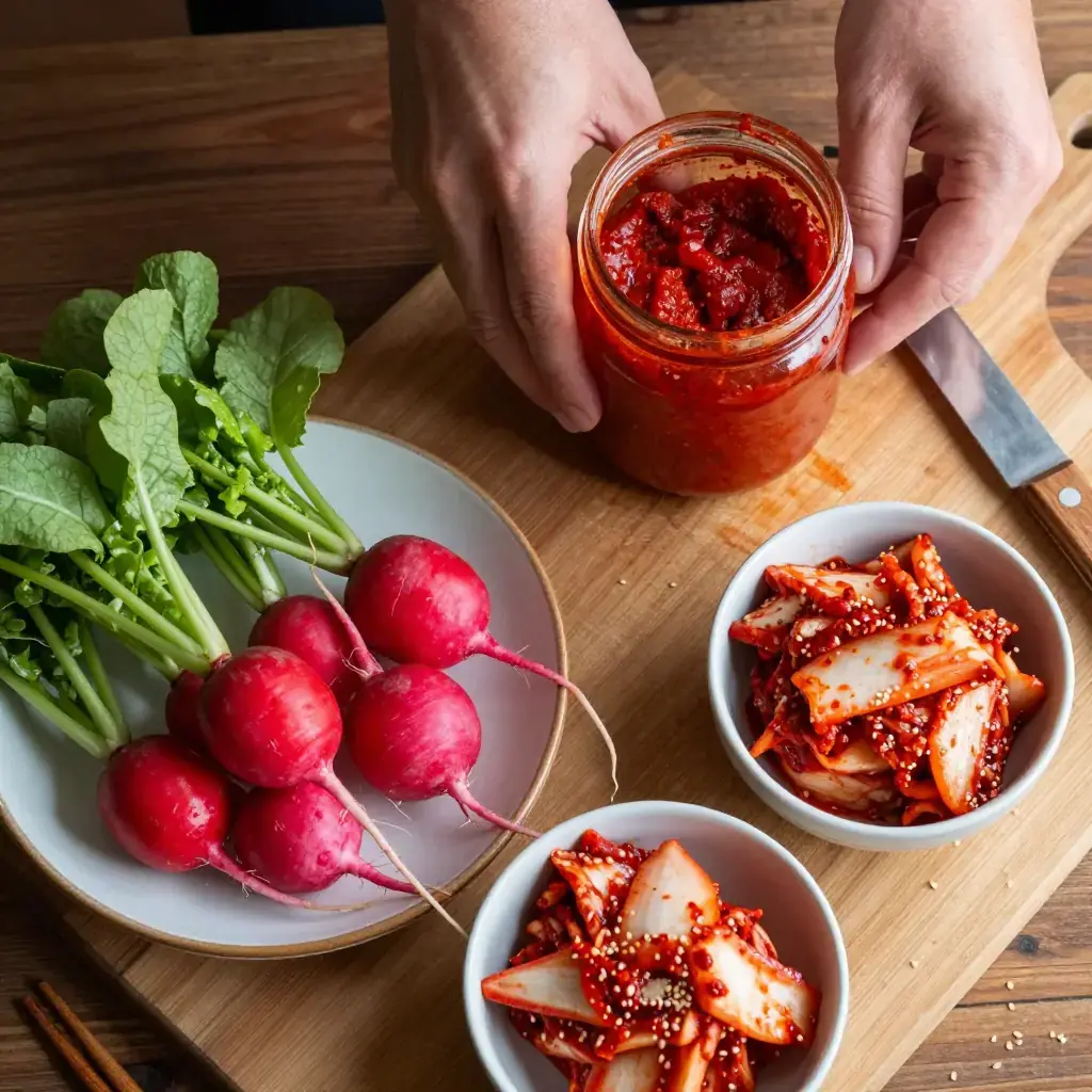 # Chonggak Kimchi Chonggak kimchi is named for the chonggak — the traditional topknot hairstyle — because the bundles of small whole radishes with their green tops resemble this style when tied together. These young ponytail radishes (chonggak mu) are fermented whole with their greens attached, creating a kimchi with dual textures: crisp, peppery radish and tender, slightly slimy fermented greens. It is one of the most beloved banchan in Korea and a staple of autumn kimjang (kimchi-making) season. Serves: 8 (as banchan) ## Ingredients - 1kg (2¼ lb) young radishes with greens attached (chonggak mu or small daikon with tops) - 3 tbsp (54g) coarse sea salt, for salting - 5 tbsp (75g) gochugaru (Korean red pepper flakes) - 4 cloves garlic, minced - 1 tsp (5g) fresh ginger, grated - 2 tbsp (30ml) fish sauce (or soy sauce for vegetarian) - 1 tbsp (15ml) fermented salted shrimp (saeujeot), optional - 1 tsp (5g) sugar - 4 spring onions, cut into 3cm (1½ inch) pieces - 1 tbsp (15g) glutinous rice paste (mix 1 tbsp rice flour with 4 tbsp water, cook briefly until thick) ## Instructions 1. Trim the radish roots and any damaged leaves. Leave the greens attached — this is what makes chonggak kimchi distinctive. Rinse well. 2. Score a shallow cross-cut into the bottom of each radish bulb (do not cut all the way through). Sprinkle with coarse sea salt, toss to coat, and leave for 1–2 hours until the radishes soften slightly and release liquid. Rinse briefly and squeeze out excess water. Pat dry. 3. In a bowl, combine gochugaru, garlic, ginger, fish sauce, saeujeot (if using), sugar, and rice paste. Mix into a thick, glossy paste. 4. Add the salted radishes, spring onions, and any radish greens to the paste. Wearing gloves, massage the paste thoroughly into the radishes and greens, working it into the score cuts. 5. Pack tightly into a sterilised glass jar or fermentation container. Press down firmly to eliminate air pockets. Leave 3–5cm (1–2 inches) headspace as gases will expand. 6. Seal and ferment at room temperature 1–2 days (summer) or 2–3 days (winter) until bubbles appear. Taste — it should be sour, spicy, and savoury. Transfer to the refrigerator. 7. Best consumed after 1 week of cold fermentation, when flavours fully develop. Keeps refrigerated for 2–3 months. **Cook's Notes:** Chonggak mu (young ponytail radishes) are available in Korean grocery stores in autumn and spring. Small daikon or French breakfast radishes with their tops can substitute. The greens contribute an important fermented texture — do not discard them.Images