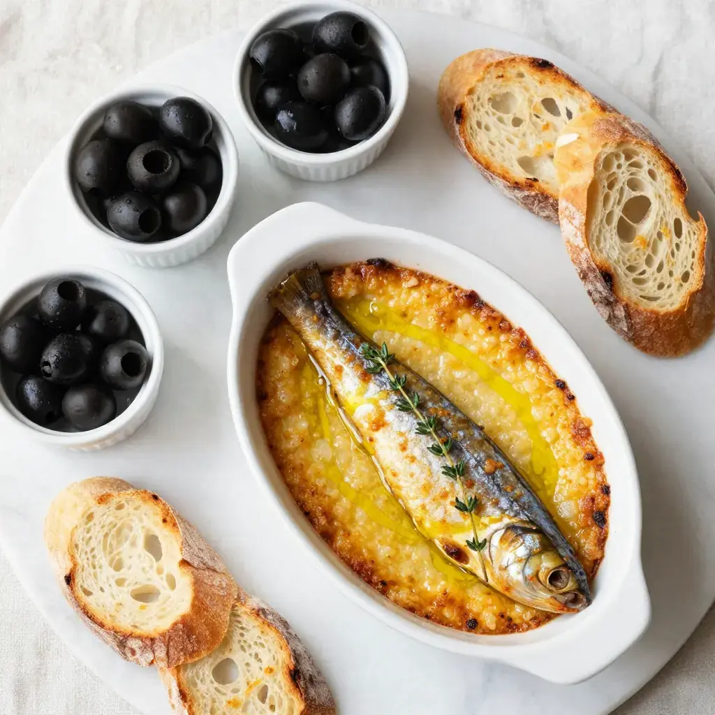 - Serve hot with toasted baguette, olives, and caperberries.