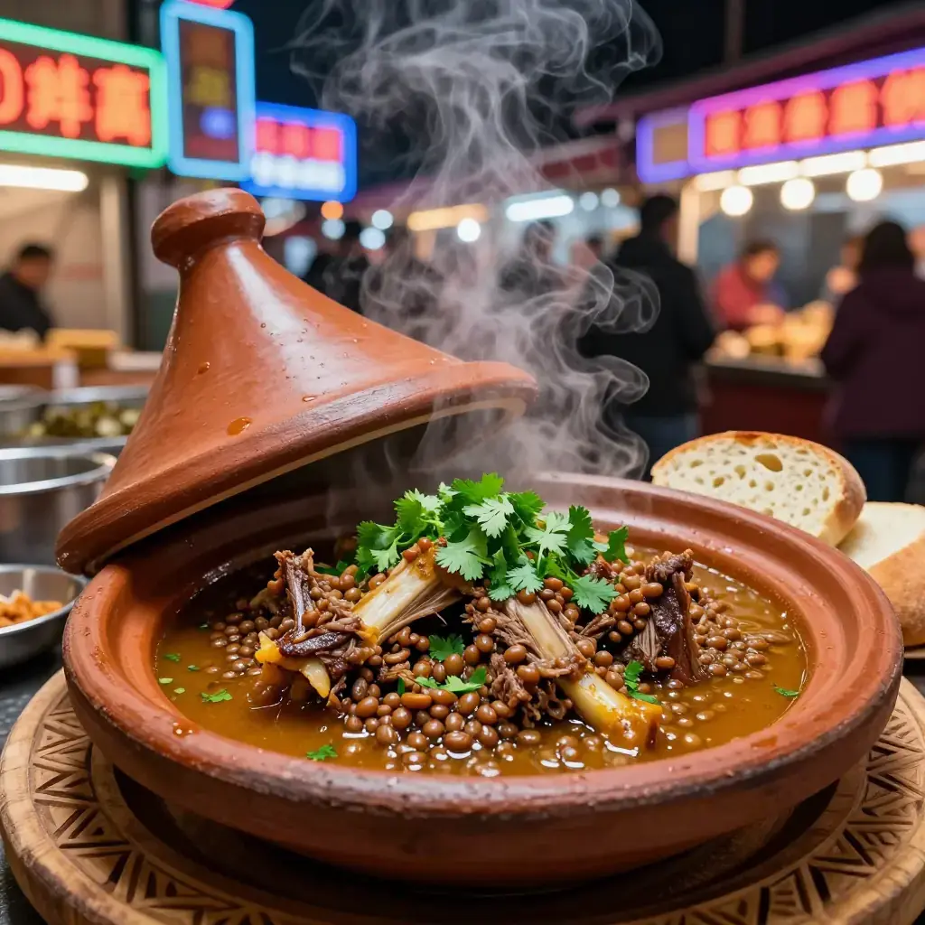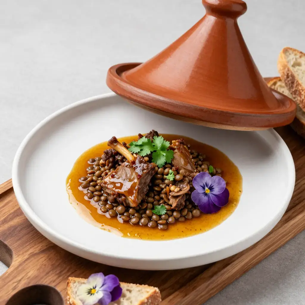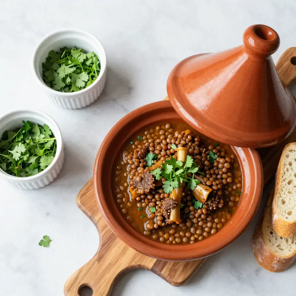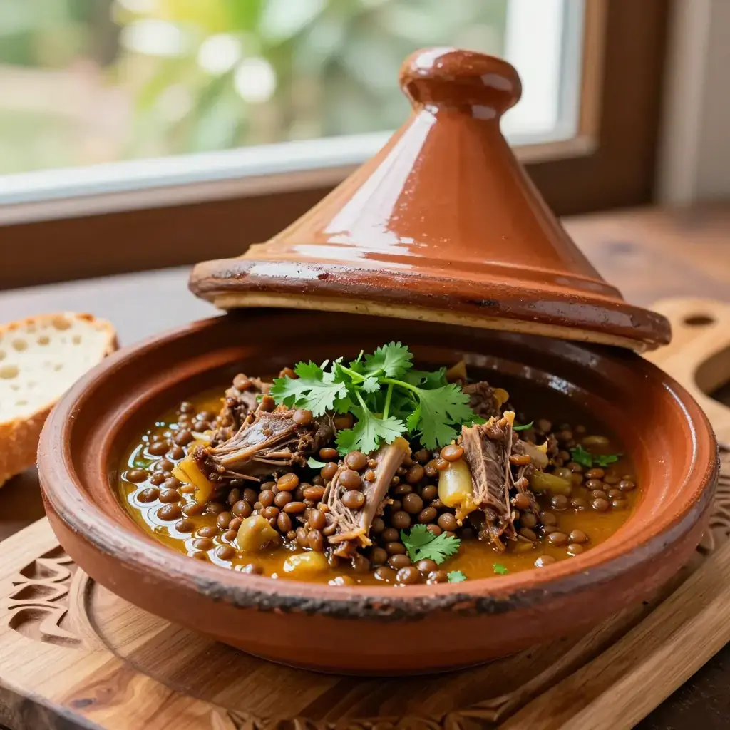 This rustic Moroccan tagine pairs tender slow-cooked lamb shoulder with earthy green lentils in a broth enriched with cumin, turmeric, preserved lemon, and a tangle of caramelised onions. Unlike the more celebratory mrouzia, this is everyday Moroccan home cooking — hearty, deeply spiced, and built for a slow cooker or low oven. It is a dish of Berber highland origin and varies by region in its spice balance.
