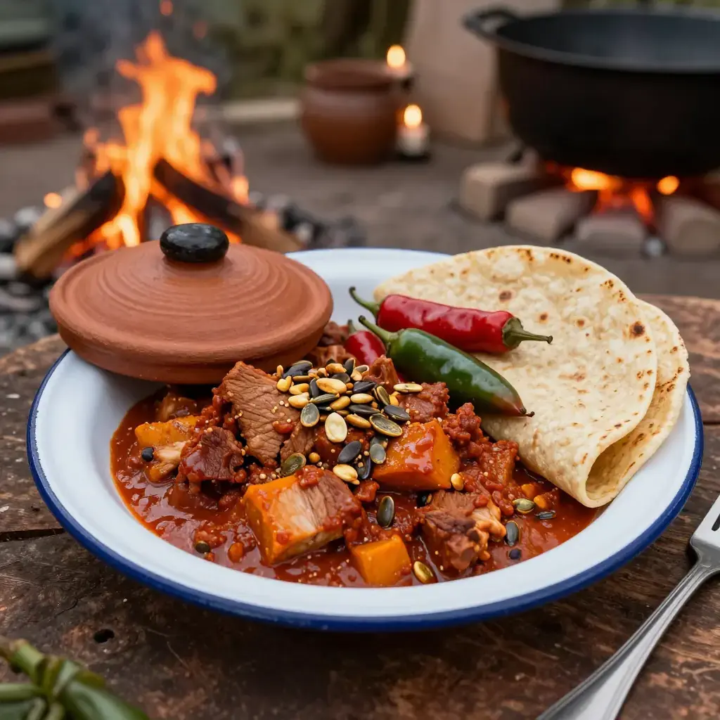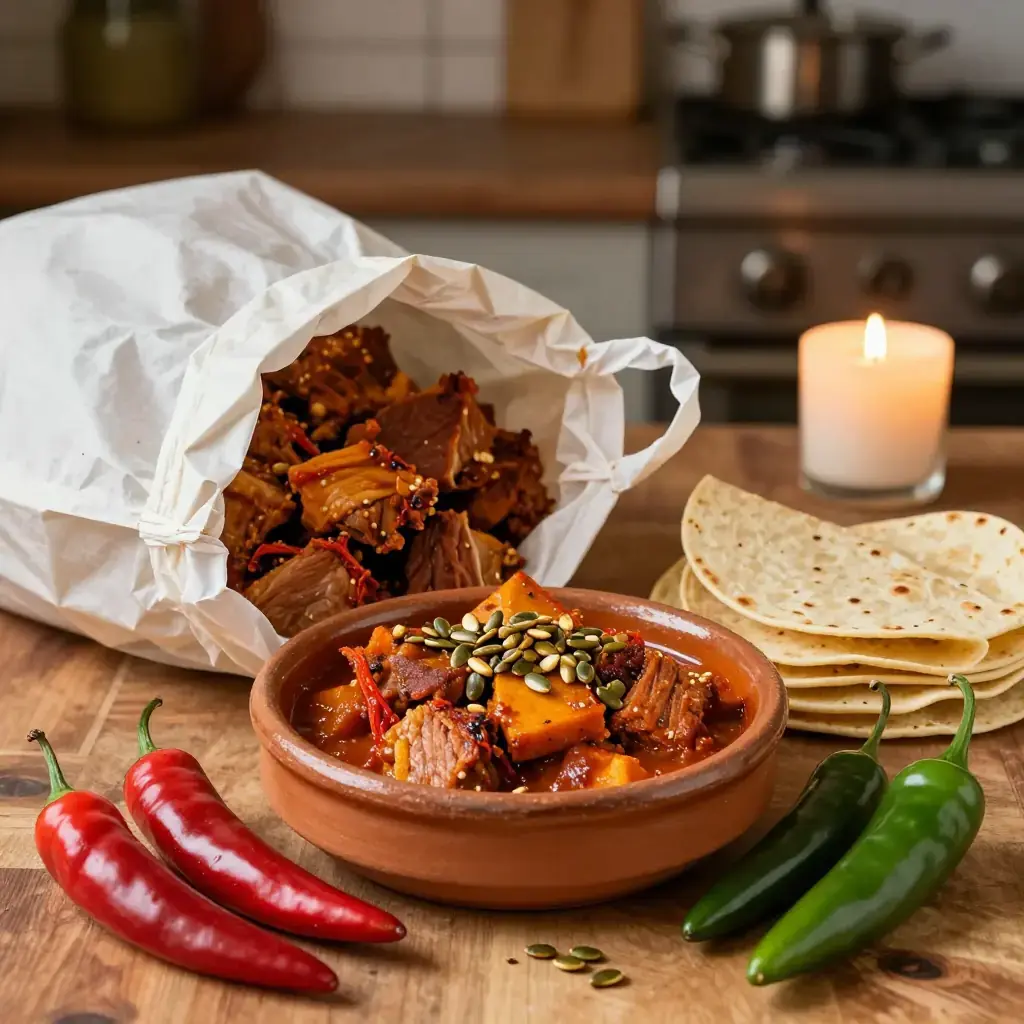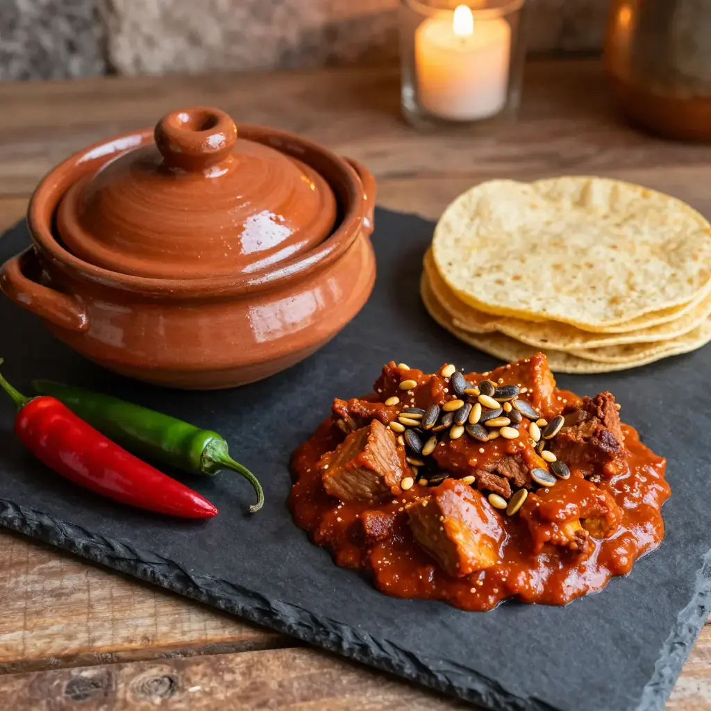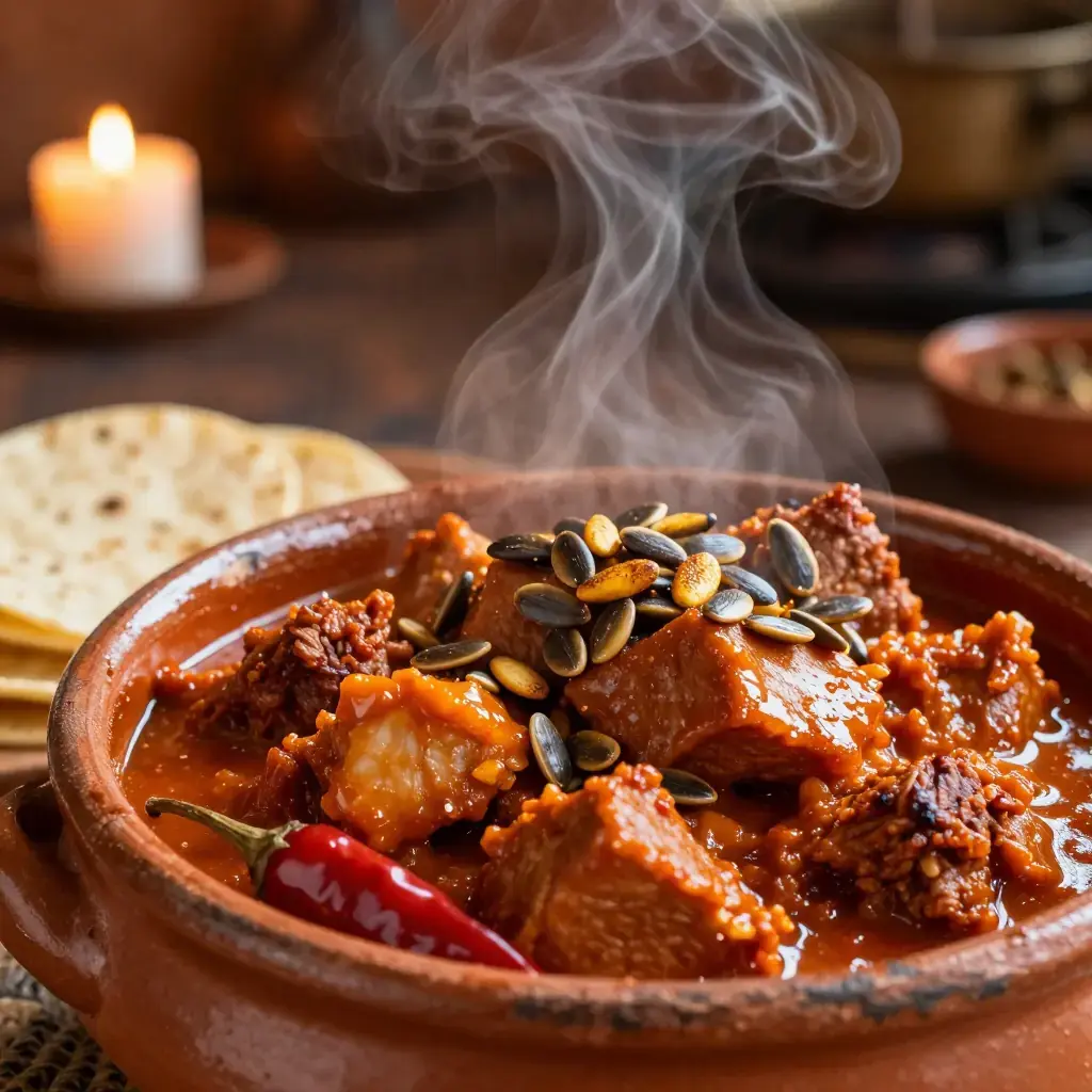 Pipián is one of Mexico's oldest sauces, documented in pre-Columbian codices and brought to its peak in the convents of colonial Puebla. The red variety combines toasted pumpkin seeds with dried chiles and tomato for a nutty, deeply savoury sauce. Stone-fruit notes come from guajillo chiles, which carry a natural tartness akin to dried cherries.