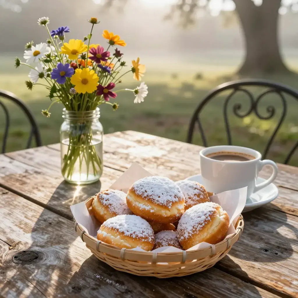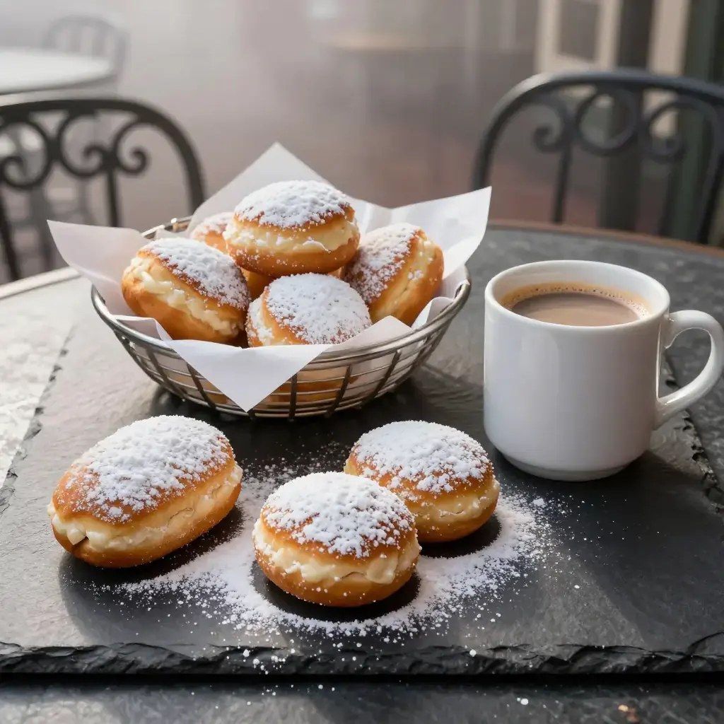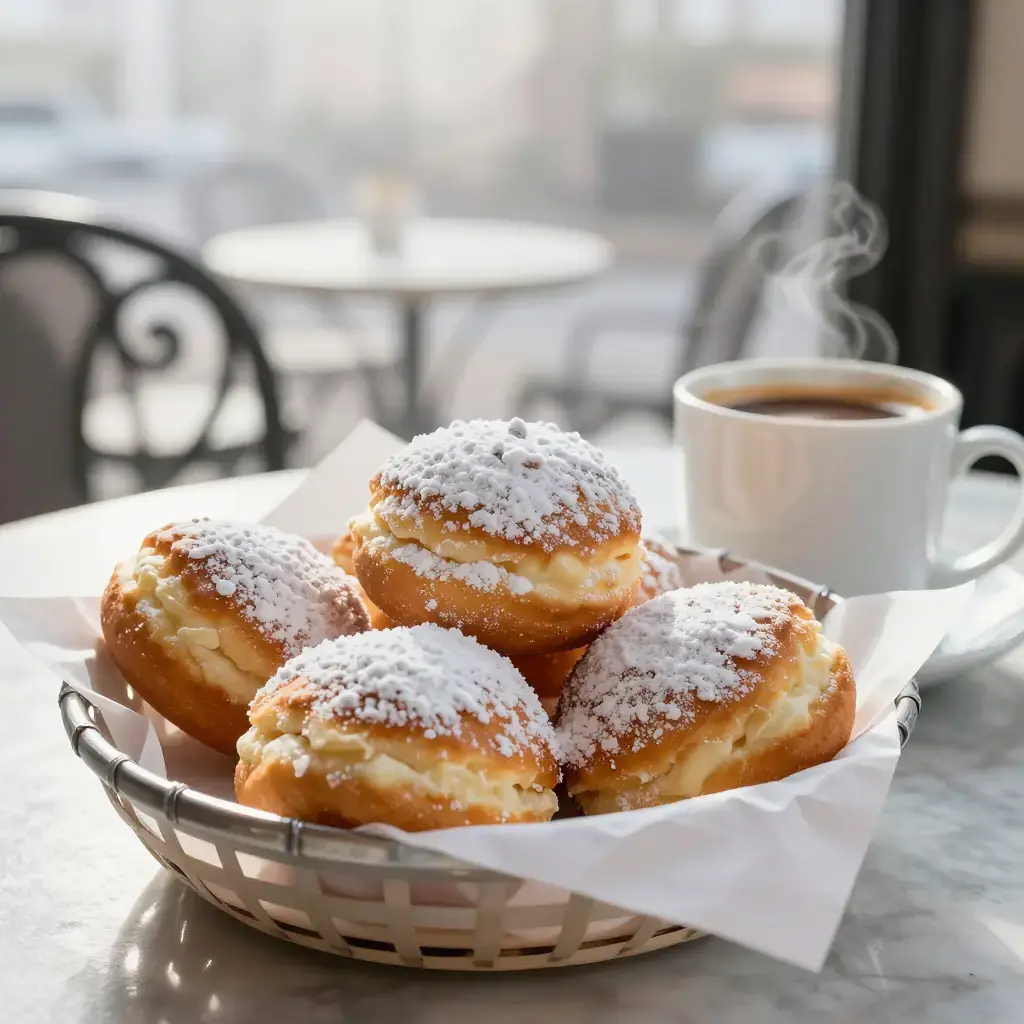 New Orleans beignets are the city's most beloved late-night ritual. Brought by French colonists in the eighteenth century and popularized at Café du Monde, these deep-fried choux-adjacent pillows are served smothered in powdered sugar, traditionally alongside café au lait with chicory. The batter rests overnight, making them a late-night weekend project that yields morning magic.