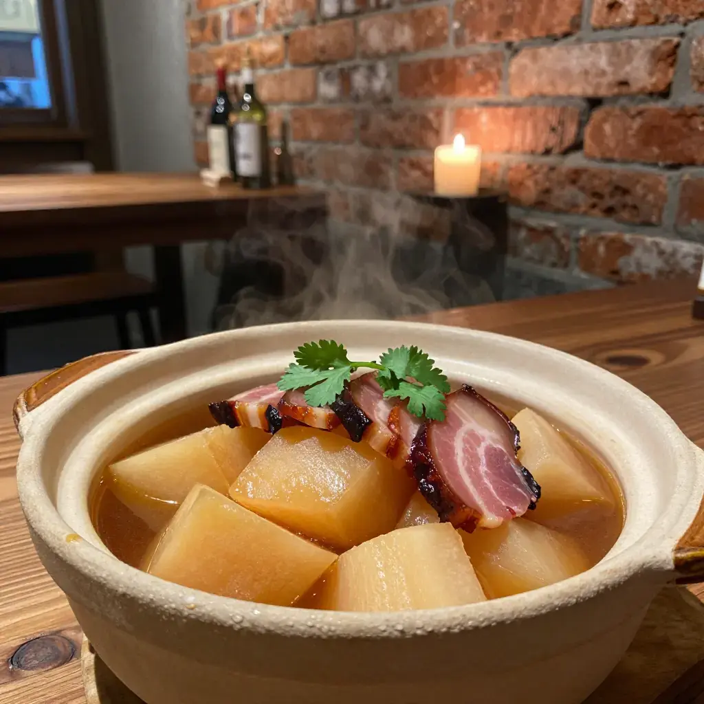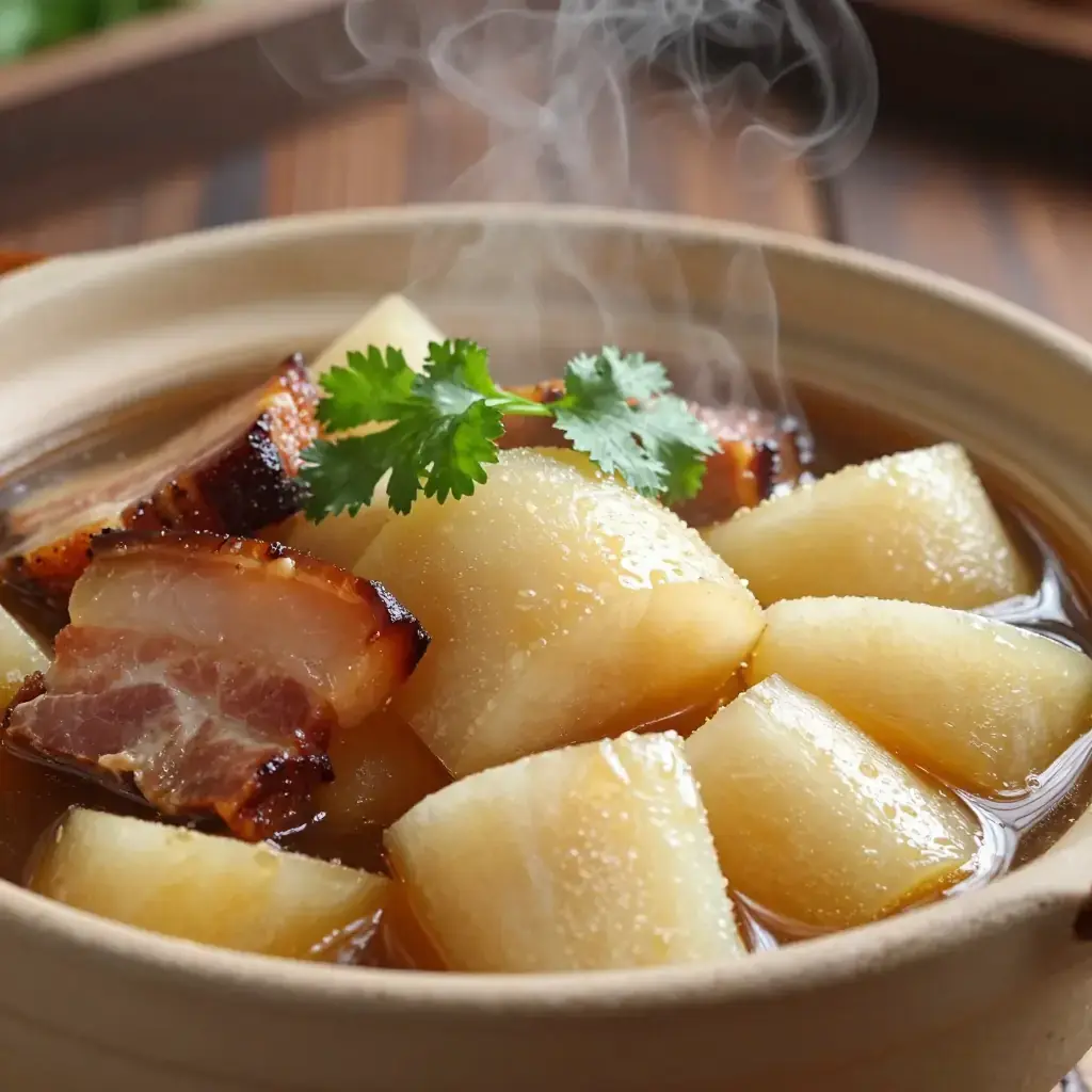 # Hunan La Rou Dun Dong Gua La rou — Hunan's smoked and salt-cured pork belly — is the backbone of the province's winter cooking. When braised with winter melon (dong gua), the smokiness of the cured meat infuses the mild, absorbent flesh of the gourd, creating a dish of remarkable depth and subtlety. This one-pot braise is a Hunanese farmhouse standard, served through the cold months when la rou hangs cured in every kitchen. Serves: 4 ## Ingredients - 400g (14 oz) Hunan la rou (smoked cured pork belly), skin on, cut into 3cm (1.2-inch) slices (substitute: Spanish-style smoked pork belly or slab bacon with a drop of liquid smoke) - 600g (1.3 lbs) winter melon (dong gua), peeled, seeded, and cut into 4cm (1.5-inch) chunks - 3 spring onions (scallions), cut into 5cm (2-inch) lengths - 5 slices fresh ginger - 3 garlic cloves, lightly crushed - 1 tbsp (15ml) Shaoxing rice wine - 1 tsp light soy sauce - 0.5 tsp ground white pepper - 700ml (3 cups) water or unsalted pork stock - 1 tbsp (15ml) vegetable oil - Fresh coriander (cilantro), to garnish ## Instructions 1. Rinse la rou slices under cold water to remove excess salt and surface smoke residue. Pat dry. 2. Heat oil in a clay pot or heavy Dutch oven over medium heat. Add ginger and garlic and stir-fry 30 seconds until fragrant. 3. Add la rou slices and brown lightly on both sides, about 3 minutes total, rendering some of the fat. 4. Pour in Shaoxing wine and let it sizzle for 30 seconds. 5. Add water or stock, bring to a boil, skim off any grey foam, then reduce heat to low. Cover and simmer 25 minutes. 6. Add winter melon chunks and soy sauce. Continue simmering, covered, for a further 20–25 minutes until the melon is tender and translucent and has absorbed the smoky broth. 7. Add spring onions and white pepper. Simmer uncovered for 5 minutes. The broth should be lightly cloudy and savoury. 8. Serve in the pot or transfer to a deep bowl, garnished with fresh coriander. **Cook's Notes:** Do not add salt until tasting at the end — la rou is already well-salted. If the pork tastes very salty, soak it in cold water for 1 hour before cooking. Winter melon should be soft but retain its shape, not mushy.Images