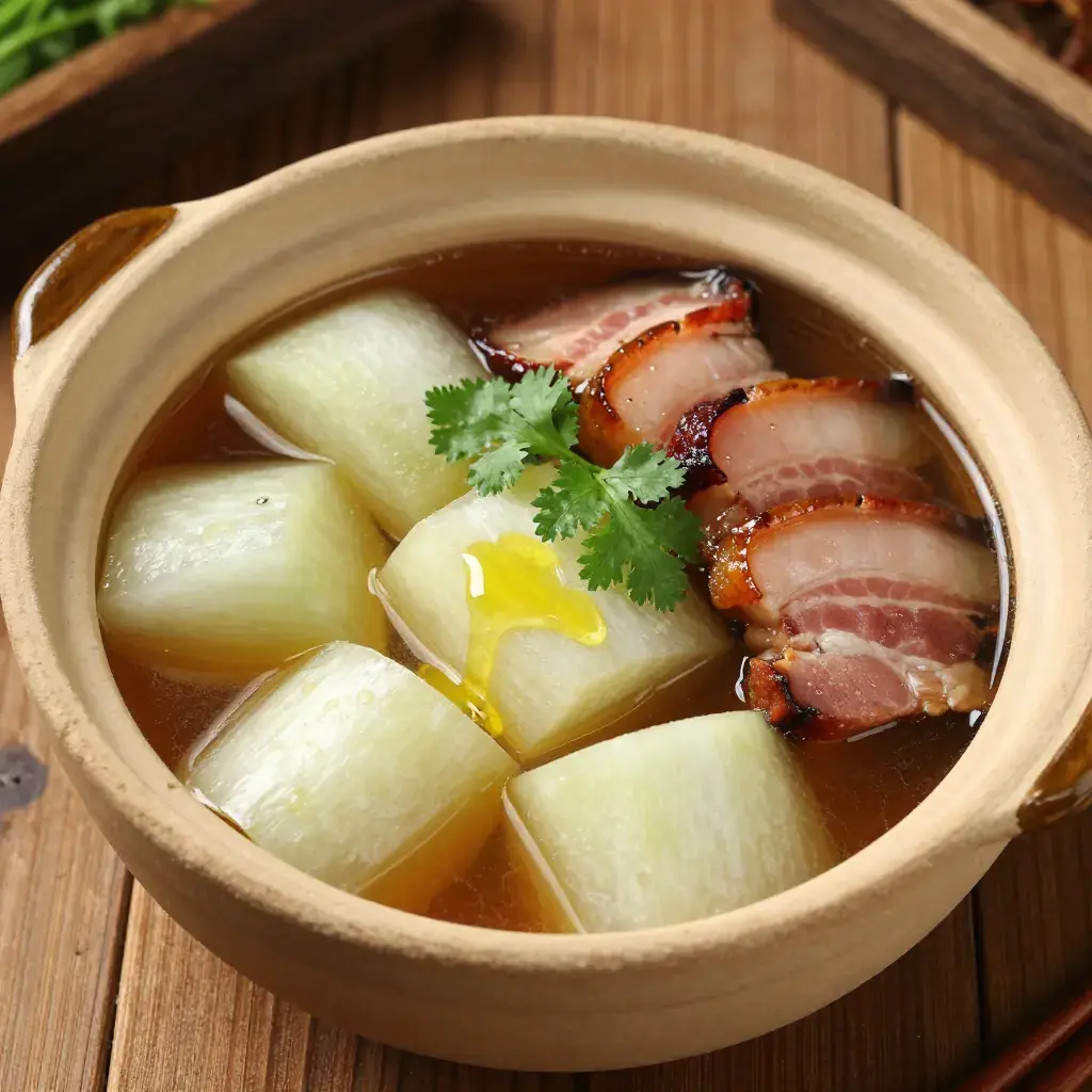 La rou — Hunan's smoked and salt-cured pork belly — is the backbone of the province's winter cooking. When braised with winter melon (dong gua), the smokiness of the cured meat infuses the mild, absorbent flesh of the gourd, creating a dish of remarkable depth and subtlety. This one-pot braise is a Hunanese farmhouse standard, served through the cold months when la rou hangs cured in every kitchen.