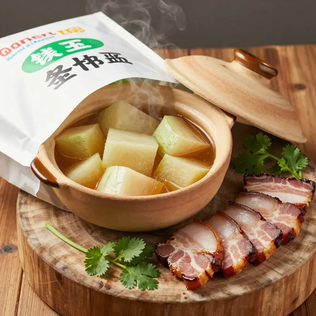 - Add winter melon chunks and soy sauce. Continue simmering, covered, for a further 20–25 minutes until the melon is tender and translucent and has absorbed the smoky broth.