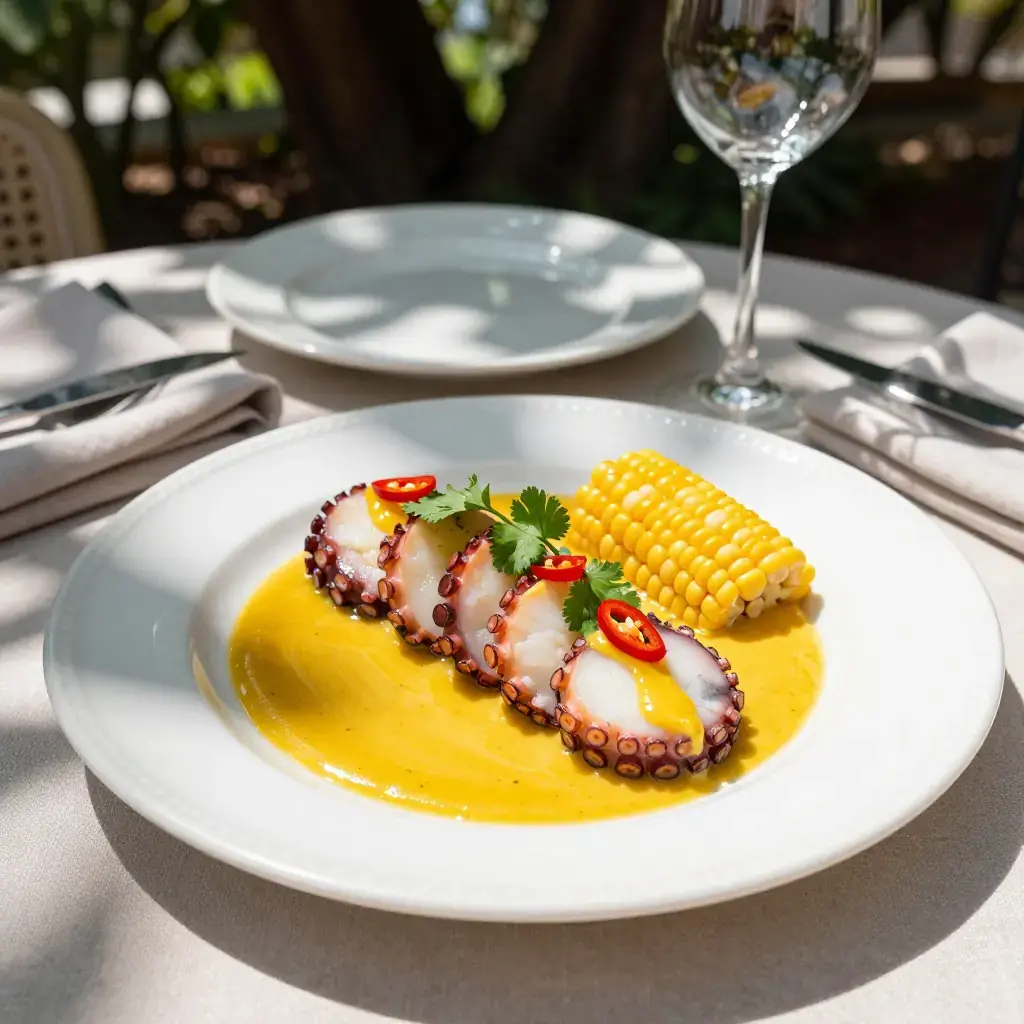 # Tiradito de Pulpo Tiradito is Peru's answer to Japanese sashimi — thin-sliced raw or just-cooked seafood dressed in leche de tigre. This version uses tender braised octopus laid over a bright aji amarillo tiger's milk, a dish found in Lima's cevicherías where Nikkei (Japanese-Peruvian) influence is most visible. Serves: 4 ## Ingredients - 800g (1¾ lb) whole octopus, cleaned - 1 cork (optional, traditional tenderising trick) - 2 limes, halved - 1 tsp salt **Aji Amarillo Leche de Tigre:** - 120ml (½ cup) fresh lime juice (about 8 limes) - 2 aji amarillo chillies, seeds removed, roughly chopped - 50g (2 oz) white fish trimmings or 1 small fillet - 1 clove garlic, minced - 2cm (¾ in) fresh ginger, peeled - 1 stalk celery, roughly chopped - ½ tsp salt - Small handful fresh coriander stems **To serve:** - 2 tbsp (30ml) aji amarillo paste - 2 tbsp fresh coriander leaves - 1 red chilli, finely sliced - Flaky sea salt - 1 ear of corn, boiled and cut into 3cm (1¼ in) rounds (choclo) - 4 leaves butter lettuce ## Instructions 1. Bring a large pot of salted water to a boil. Dip the octopus in and out three times to curl the tentacles, then submerge fully. Add the cork if using. Simmer on low heat 45–60 minutes until a skewer meets no resistance. Cool in the cooking liquid 20 minutes. 2. Remove octopus and refrigerate uncovered 30 minutes to firm up. Slice tentacles on the bias into 5mm (¼ in) medallions. 3. Make the leche de tigre: blend lime juice, aji amarillo, fish, garlic, ginger, celery, coriander stems, and salt for 30 seconds. Strain through a fine sieve, pressing well. Taste — it should be bright, spicy, and citrus-forward. Chill until ready to serve. 4. To assemble: pool 60ml (¼ cup) leche de tigre on each chilled plate. Arrange octopus slices in a fan over the sauce. Dot with aji amarillo paste. 5. Scatter coriander leaves and red chilli slices. Add choclo rounds and a lettuce leaf. Finish with flaky salt and serve immediately. **Cook's Notes:** The leche de tigre should be made and used within 2 hours for best flavour. Chilling your plates beforehand keeps the dish cold at the table. If aji amarillo chillies are unavailable, substitute 1 habanero plus 1 red bell pepper for similar colour and heat.Images