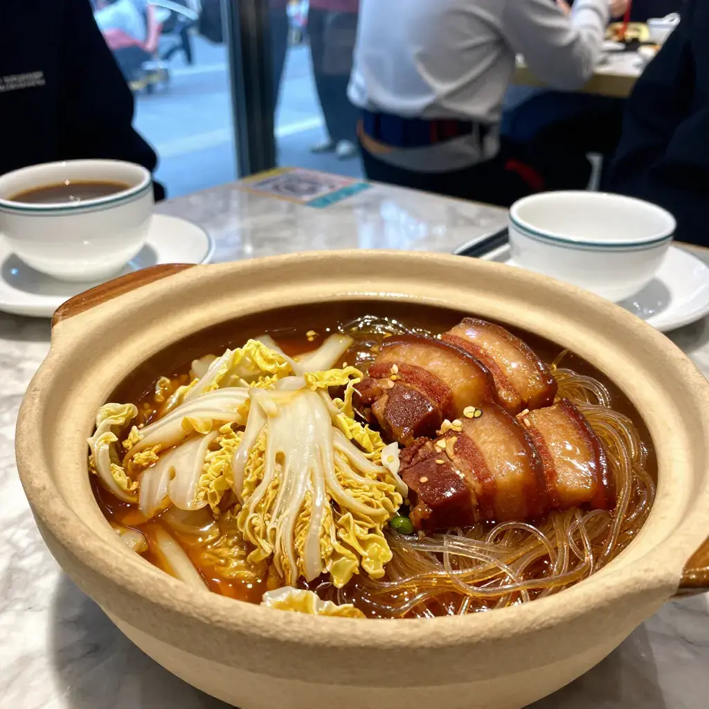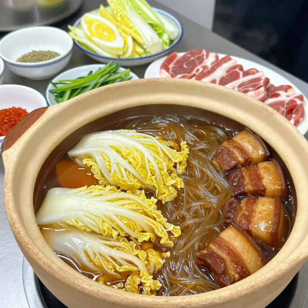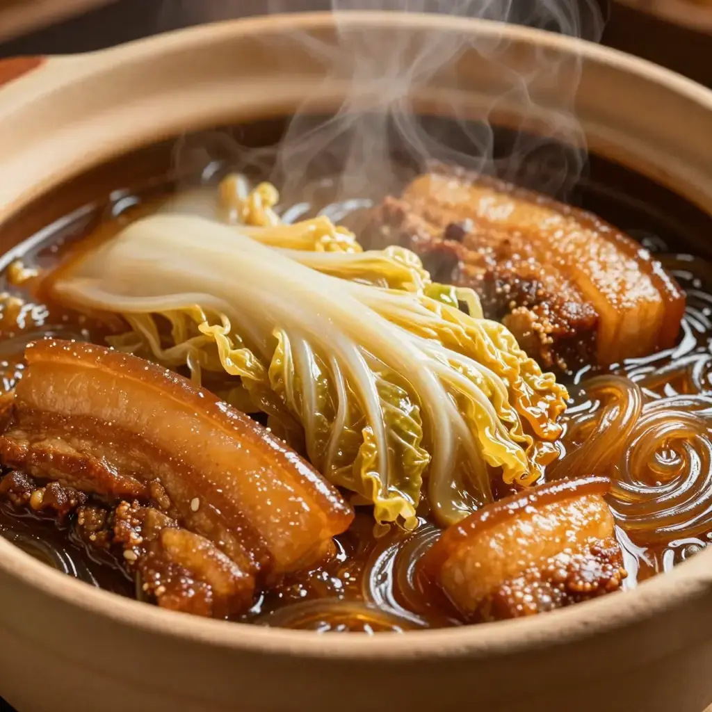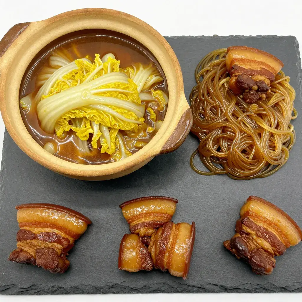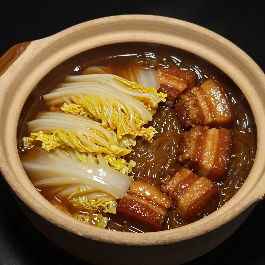 Dongbei bai cai dun rou is the very soul of northeastern Chinese winter cooking. Pork belly is slowly braised with napa cabbage (bai cai) and glass noodles in a simple but deeply savoury broth seasoned with soy, ginger, and star anise. The cabbage collapses into silky ribbons while the glass noodles soak up every drop of pork-rich liquid. Every household in Heilongjiang, Jilin, and Liaoning has its own version.