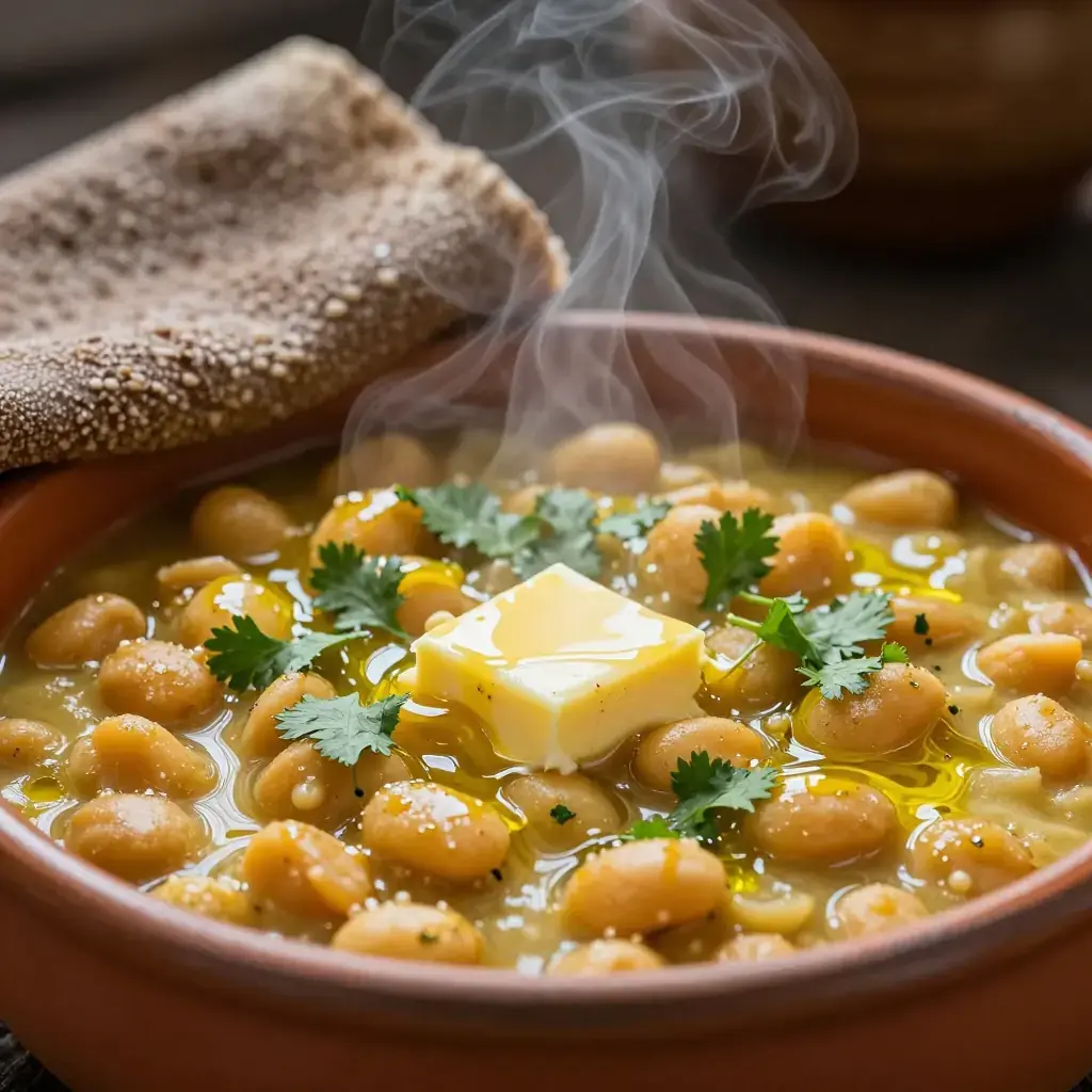 Cook's Notes: Niter kibbeh is infused clarified butter made with onion, garlic, ginger, fenugreek, and Ethiopian spices — it is what gives the dish its characteristic depth. You can make it ahead or buy it at Ethiopian grocery stores. The overnight soak is essential for dried fava beans; canned beans can be substituted by adding them at step 4 and reducing simmering time to 10 minutes.