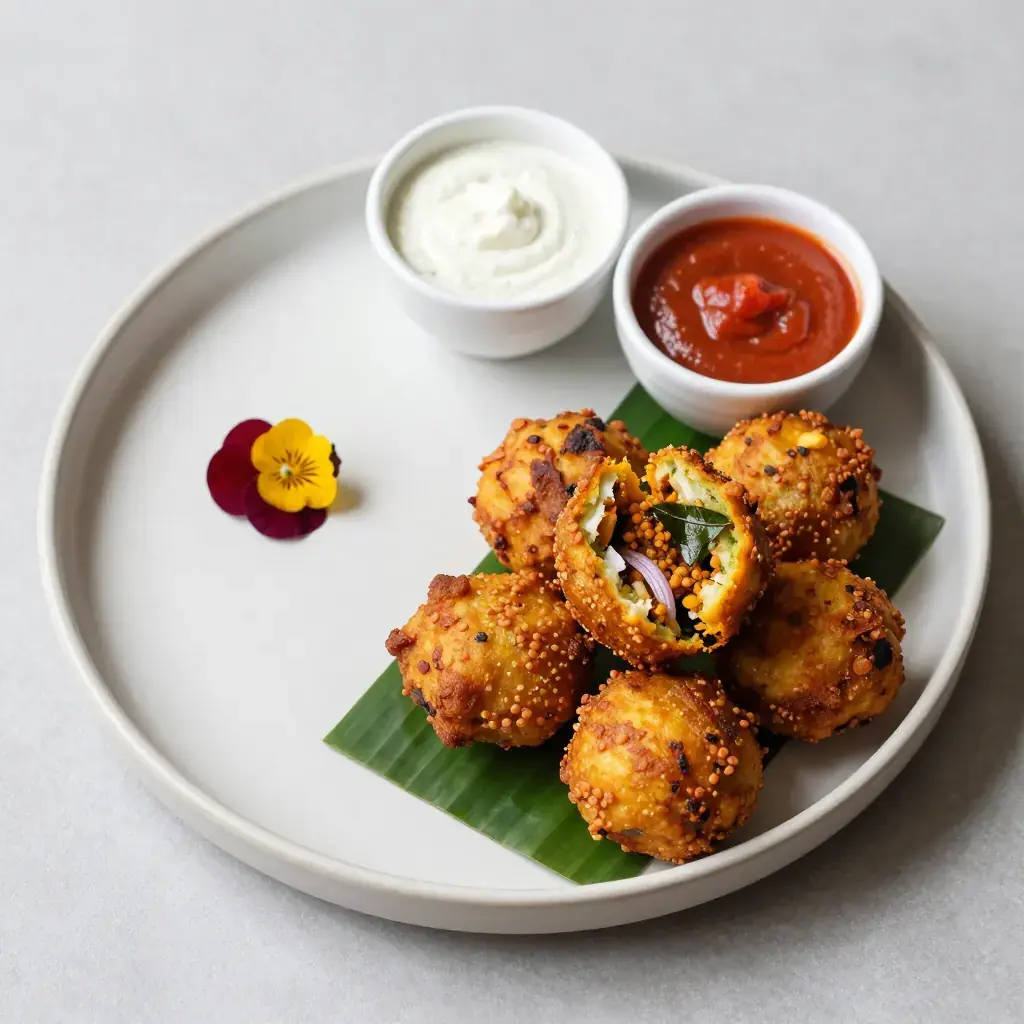 # Masala Vada (மசால வடை) Masala vada are the quintessential South Indian teatime snack — crispy, craggy discs of coarsely ground chana dal (split chickpeas) spiked with green chilli, curry leaves, and ginger, then deep-fried to a shattering golden crunch. Sold at every roadside stall in Tamil Nadu and Karnataka, they are as essential to South Indian food culture as samosas are in the north. Serves: 4 (makes 12–14 vadas) ## Ingredients - 250g (9 oz / 1¼ cups) chana dal (split chickpeas), soaked in cold water 2–3 hours - 2–3 green chillies, finely chopped - 1 medium onion, finely diced - 2 tbsp fresh coriander (cilantro) leaves, finely chopped - 8–10 fresh curry leaves, torn - 1 tsp grated fresh ginger - 1 tsp fennel seeds - ½ tsp cumin seeds - 1 tsp salt - Oil for deep-frying **To serve** - Coconut chutney - Tomato chutney - Hot chai ## Instructions 1. Drain the soaked chana dal thoroughly. Reserve 2 tbsp whole dal. Coarsely grind the remaining dal in a food processor — pulse 8–10 times until the texture resembles coarse breadcrumbs. Do not blend smooth; the rough texture creates the characteristic craggy surface. 2. Transfer to a mixing bowl. Add the reserved whole dal, green chillies, onion, coriander, curry leaves, ginger, fennel seeds, cumin seeds, and salt. Mix well with your hands. 3. Test the consistency: the mixture should hold its shape when pressed into a disc. If too wet, add 1–2 tbsp rice flour. If too dry, add a few drops of water. 4. Heat oil in a deep wok or kadai to 175°C (350°F). Wet your hands, take a golf ball-sized portion of the mixture, flatten it between your palms into a disc about 6–7cm in diameter and 1cm thick, and carefully slide into the oil. 5. Fry in batches of 4–5 for 3–4 minutes per side until deep golden brown and crispy throughout. Remove with a slotted spoon and drain on paper towels. 6. Serve hot with coconut chutney and tomato chutney. **Cook's Notes:** The coarseness of the grind is crucial — over-blending makes the vada dense rather than crunchy. Some cooks add a small amount of raw grated beetroot or carrot for colour and sweetness. Masala vada can be kept warm in a low oven (100°C) for up to 30 minutes without losing too much crunch.Images